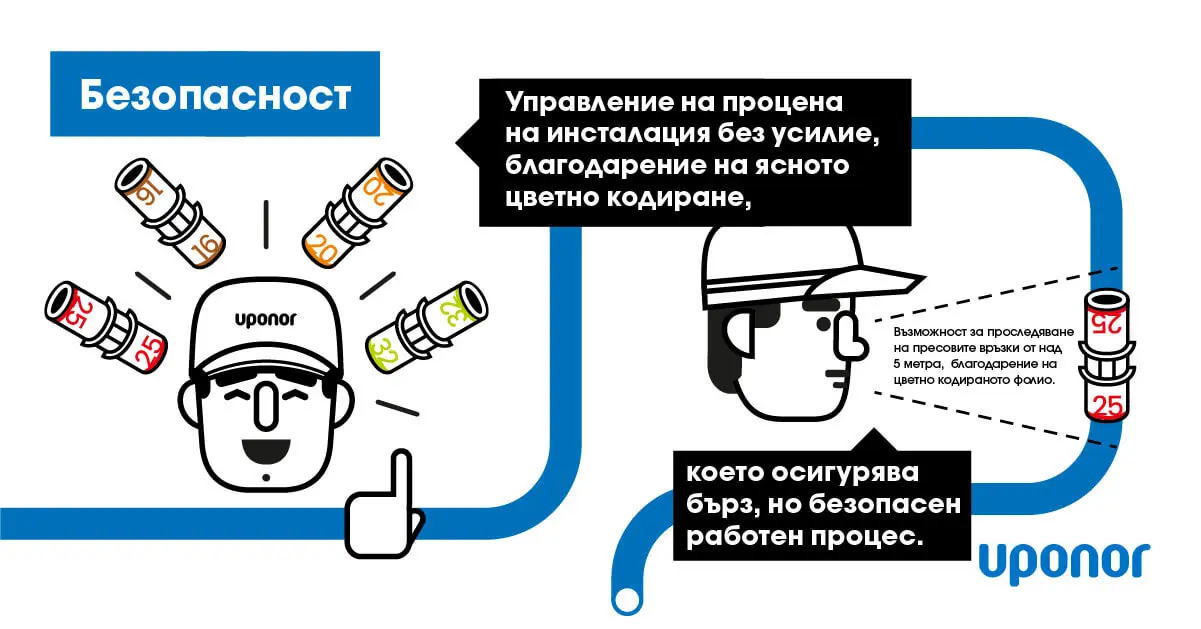 - Безопасност чрез ясно цветово кодиране на фитингите и пресовите инструменти