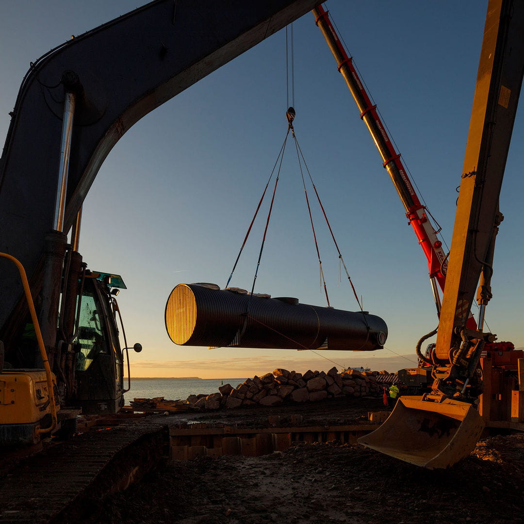Initially, there was no guarantee that Öresundskraft would choose Uponor Infra and Weholite. The initial plan involved creating an in-situ cast concrete structure. However, the choice became easy when Öresundskraft considered the advantages of Weholite: the huge savings to be made and no risk from concrete disintegrating through exposure to seawater. The pump station is the largest prefabricated structure in Sweden, at 23 metres long and with dimensions of ID/OD3,500/3,900mm. Weholite enabled the pump station to be prefabricated at Uponor Infra’s factory in Fristad, transported to Helsingborg, and lowered into place in a water-filled sheet-piled cofferdam. This method hugely rationalised the work and would not have been possible on the basis of concrete construction.
