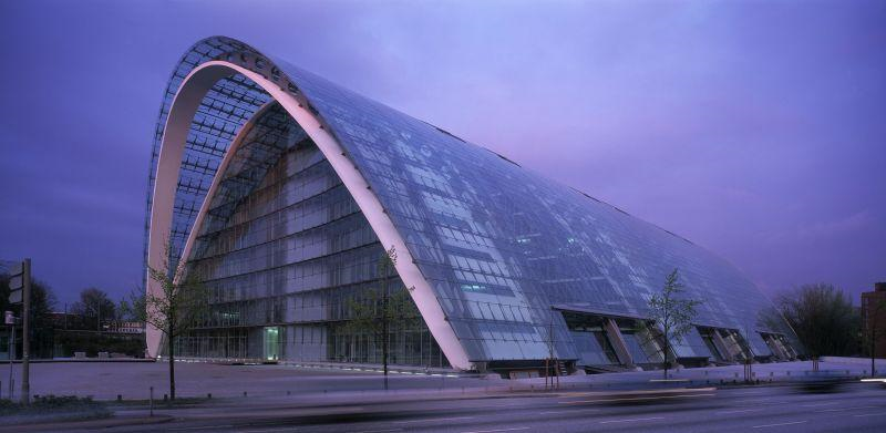 It was the first time that the prestigious MIPIM award of the world’s largest real estate trade fair in Cannes had been given to an architect from Germany. Hadi Teherani (BRT Architekten), a Hamburg-based architect, received the award for Best Office Building, the "Berliner Bogen" in Hamburg. The new office building has been erected over a canal basin. With a length of approx. 140 metres, the building spans the end tip of a high-water reservoir. Twenty-two steel girders with a height of up to 33 metres (diagonally entangled in pairs) bear the total load of the building shell and large components of the solid reinforced-concrete arch as well as the concrete ceilings. The area of the former canal basin, which serves today as a mixed-water detention reservoir, was spared most of the load thanks to this construction.