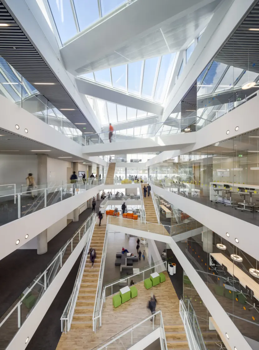 Built in 2013/14, the atrium building with a panoramic view features architectural finesse in a future-oriented waterfront environment. In 2014, it was awarded the German Design Award in the "Architecture and Urban Space" category. Its 360° design offers a clear view of the city and the harbour. With a total area of 8,600 m2, the building houses a variety of educational facilities, offices and meeting rooms over five floors.