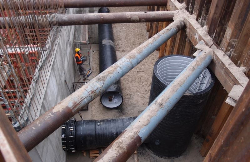 The two raw water intakes, which were constructed using PE100 DN 1000 SDR 17 pressure pipes, will provide the 500 MW power-unit pump station with cooling water from the River Vistula. A pressure pipeline connecting the raw water pumping station with the water treatment plant was constructed using PE100 DN800 SDR22 pipes laid in a trench. For the pipeline, PE100 DN800 SDR 17 pipes were installed – using the horizontal drilling method (HDD) – under the bed of the discharge canal. A gravity pipeline feeding mechanically pre-treated water from the cold-water intake to the raw water pumping station was constructed using the Weholite DN1000 SN8 pipe, with Weho DN1800 manholes added for maintenance purposes.
