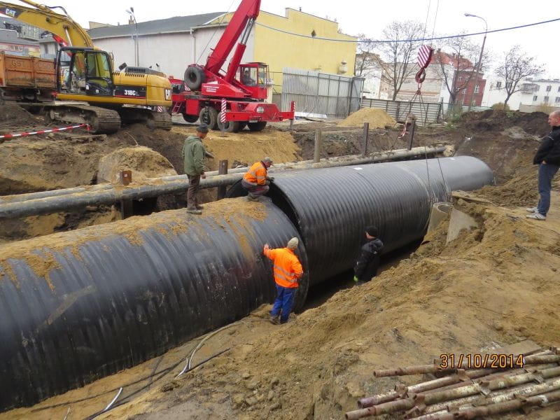 Uponor Infra delivered for this project 4 fire water tanks Weho of diameter dn3000mm, ring stiffness SN2, length of 11,15-32,84m and total capacity of 460m³. The tanks are to be used as a water reserve for the sprinkler system in the shopping mall and are filled from the municipal network. The water from the tanks is supplied to the pumping stations. The tanks are equipped with suction strainers, floating valves, liquid level sensors and emergency overflows. The individual segments of the tanks were installed under the extrusion welding method, carried out by Uponor Infra Service Group, ensuring the uniformity and tightness of the structure.
