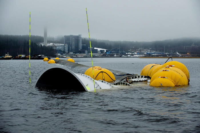 The pipes were submerged to the bottom of Lake Päijänne between June and November. Special equipment was required to submerge the massive pipes, which were 300 metres in length and three metres in diameter. The submerging process was aided with the use of a special ferry, lightening sacks and a multipurpose tugboat equipped with hoists. The submerging direction was carefully planned in accordance with natural underwater currents. Divers made the last bulkhead connection at a depth of 10 metres.