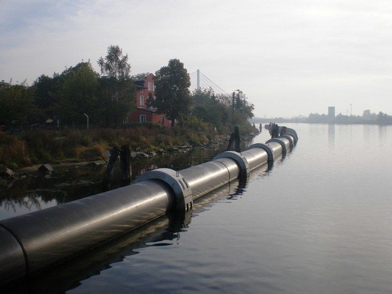 Two discharge pipelines with the length of 375m each and diameter of DN/OD 1600 mm were butt welded directly next to the river Martwa Wisła (Dead Vistula).The pipelines were then fitted with end closures, ballasted with reinforced concrete weights and towed by tugboats to Gdańsk Bay. The trenches had been dug in Gdańsk Bay and water was pumped into the pipelines in order to sink them. The last installation phase was under water and involved joining the pipelines with outlet chambers and receiving tanks, which connect outlets with the pipelines installed on the beach. In spite of periodically unfavourable weather conditions, the whole operation was smooth and easy. The installation phase of the project was finished in the end of 2012.