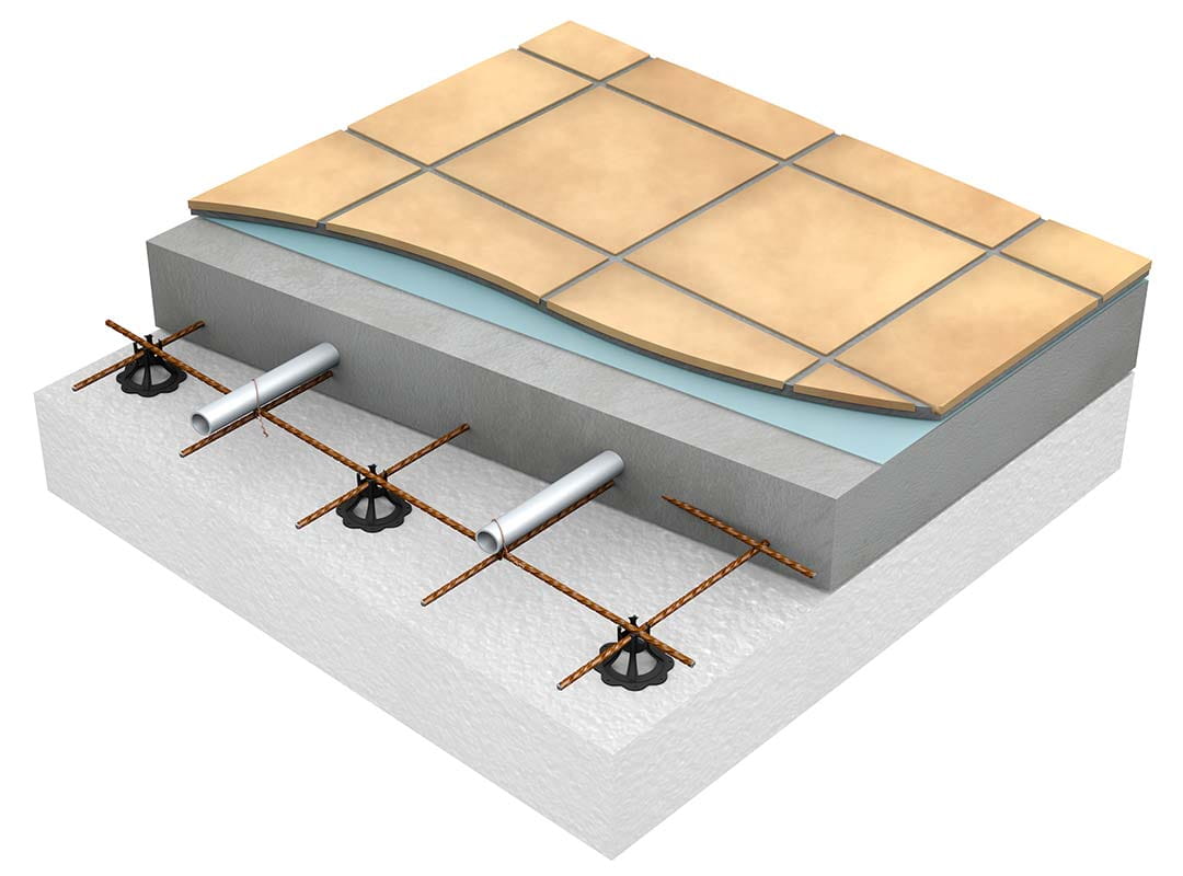 Gulvvarmerør lagt på armering og indstøbt i beton. Uponor Comfort Pipe PLUS rør (20 x 2 mm) lægges med 300 mm mellem rørene og fastgøres mod armeringsnettet. Derefter indstøbes rørene og dækkes med min. 30 mm beton.