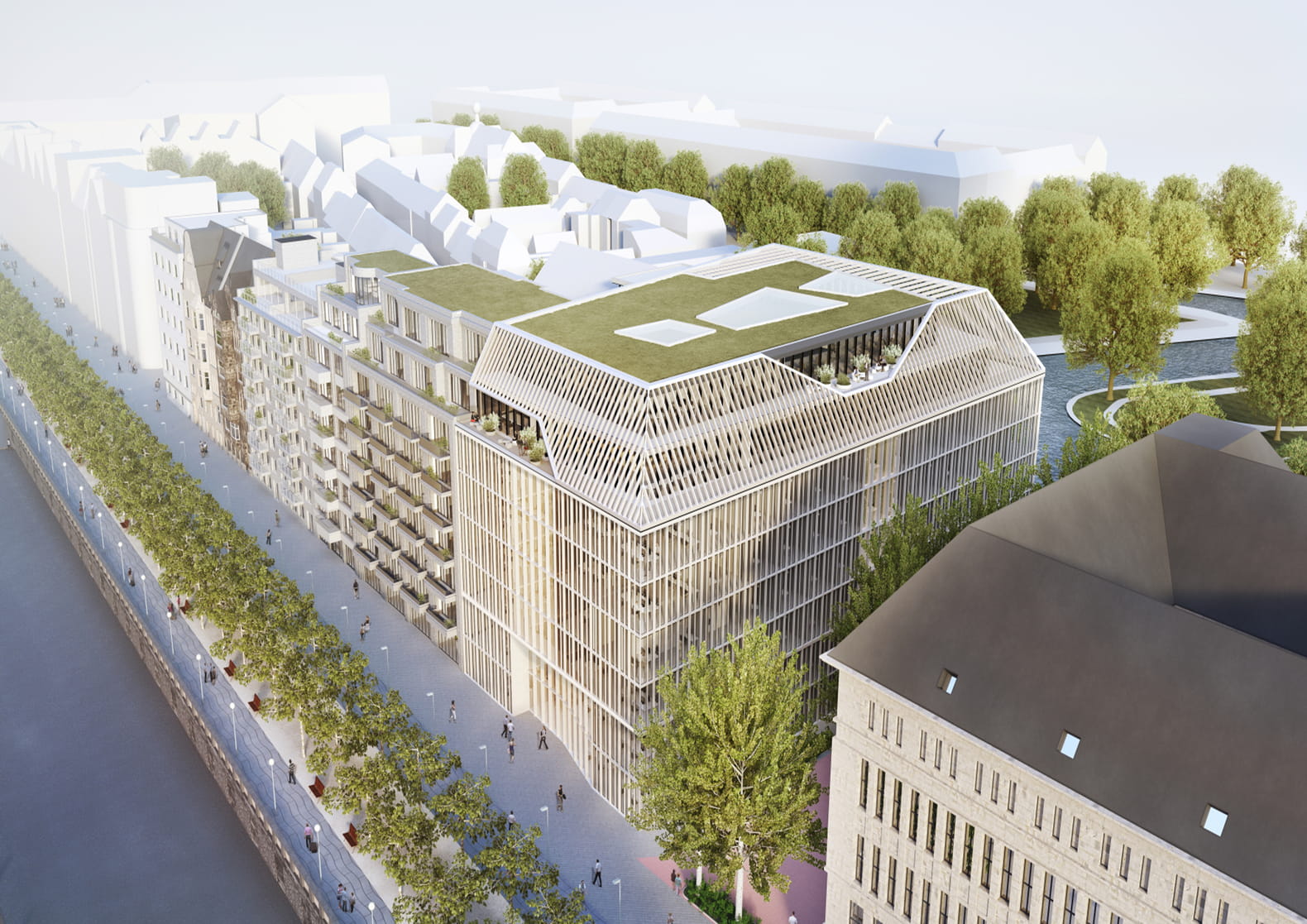 The largest independent tour operator in Germany, Alltours, is building a new company headquarters in Düsseldorf. In future, 13,500 square meters of office space will provide enough room for around 630 employees. The new building is in a prominent location: the office building is being constructed directly on the banks of the Rhine - opposite the listed Behrensbau building and in the immediate vicinity of the Mannesmann high-rise. The defining design element of the new ten-storey building is a filigree, vertically structured façade structure that continues up to the sloping roof. With its striking but visually calm agency language, the building blends harmoniously into its surroundings. In the middle of the building complex, a connecting atrium is being created, which offers a high quality of stay all year round thanks to its bright and attractive atmosphere. In future, employees will be able to relax on the top floor of the building - on the outdoor terrace, in the chill-out area or in an area with sports and health facilities.