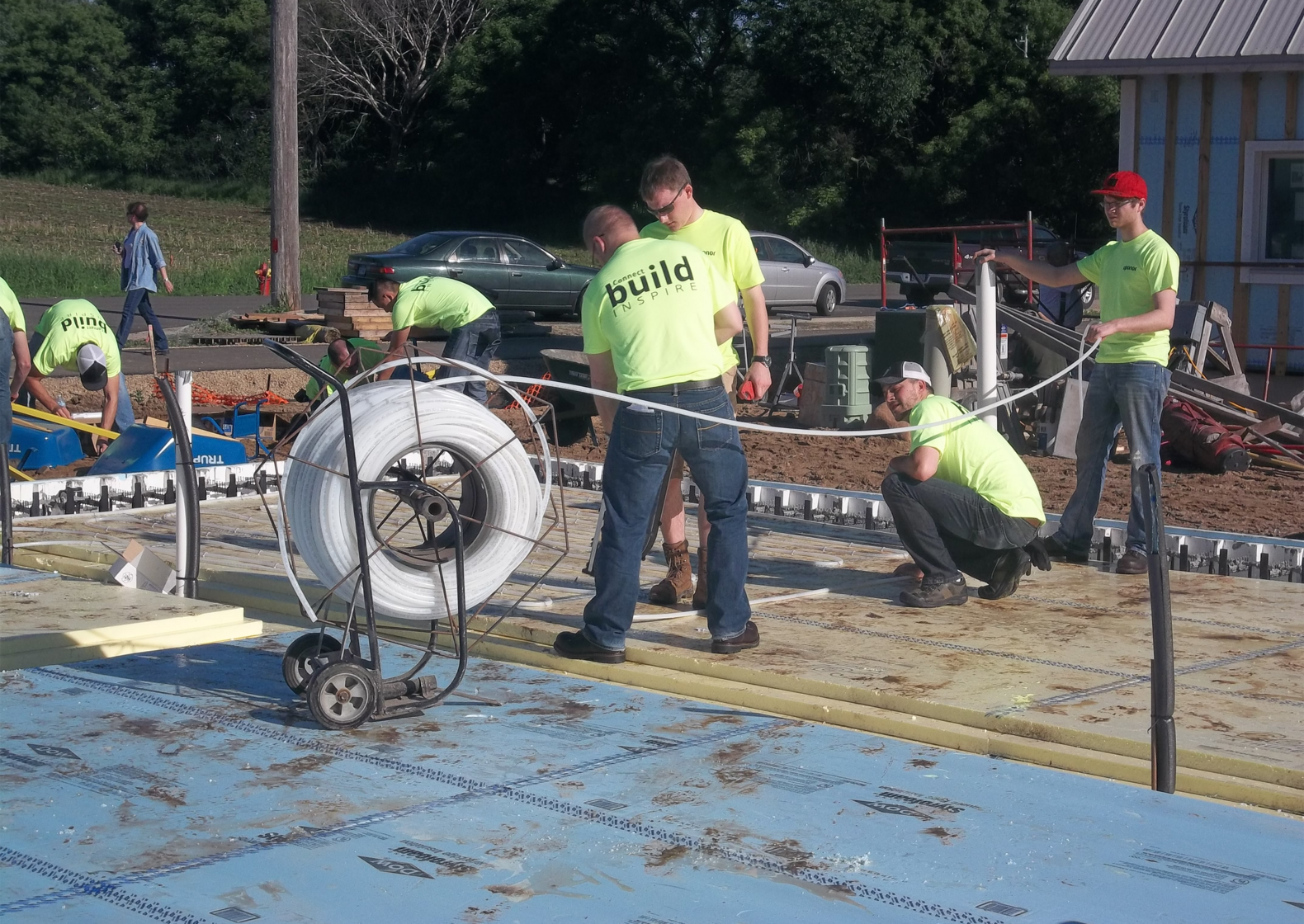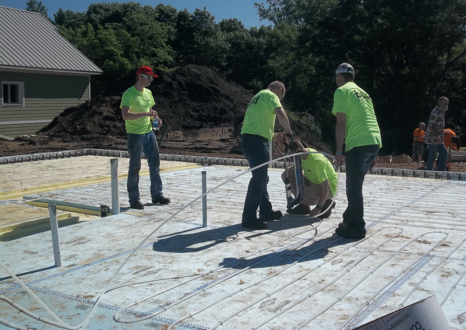 Uponor partners with Habitat for Humanity to build homes in Eco Village; Wirsbo hePEX radiant heating system installation.