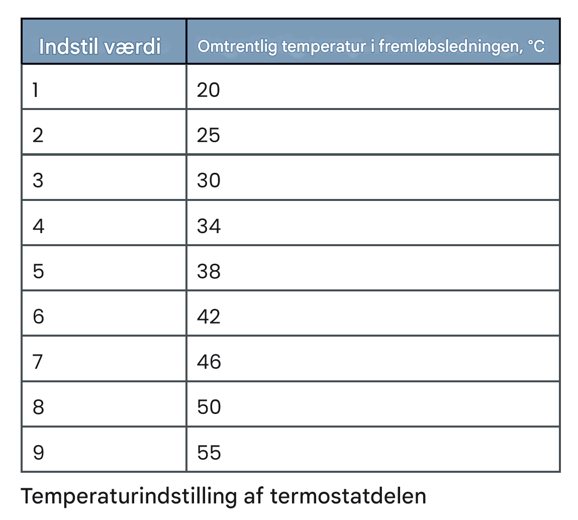 Tabel: Temperaturindstilling af termostaten