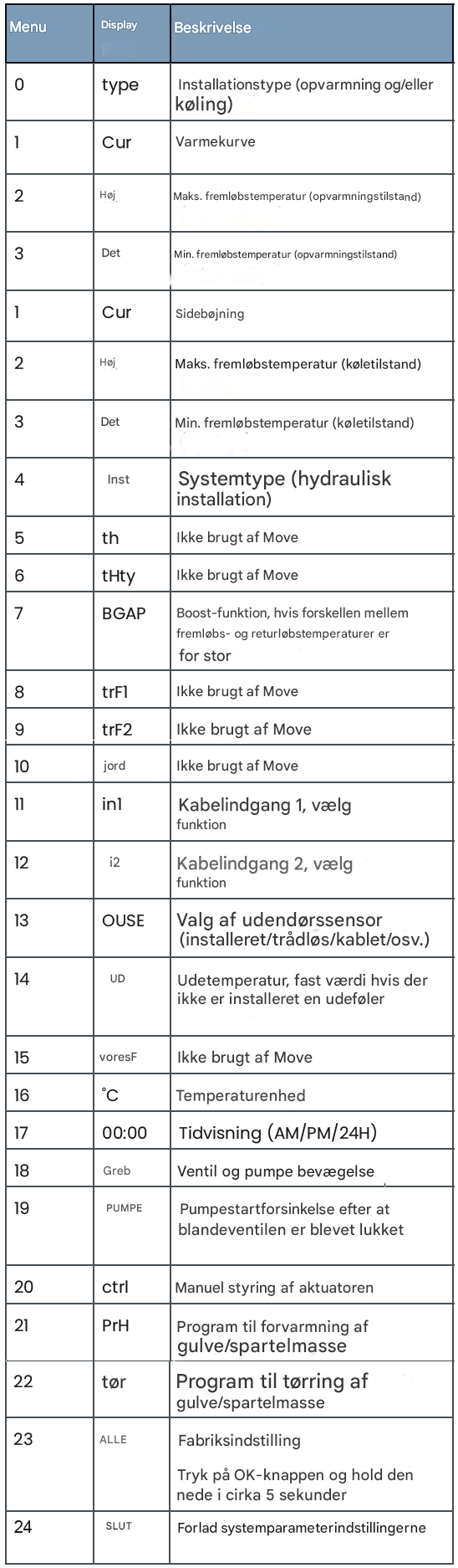 - Se tabellen til højre for parametre