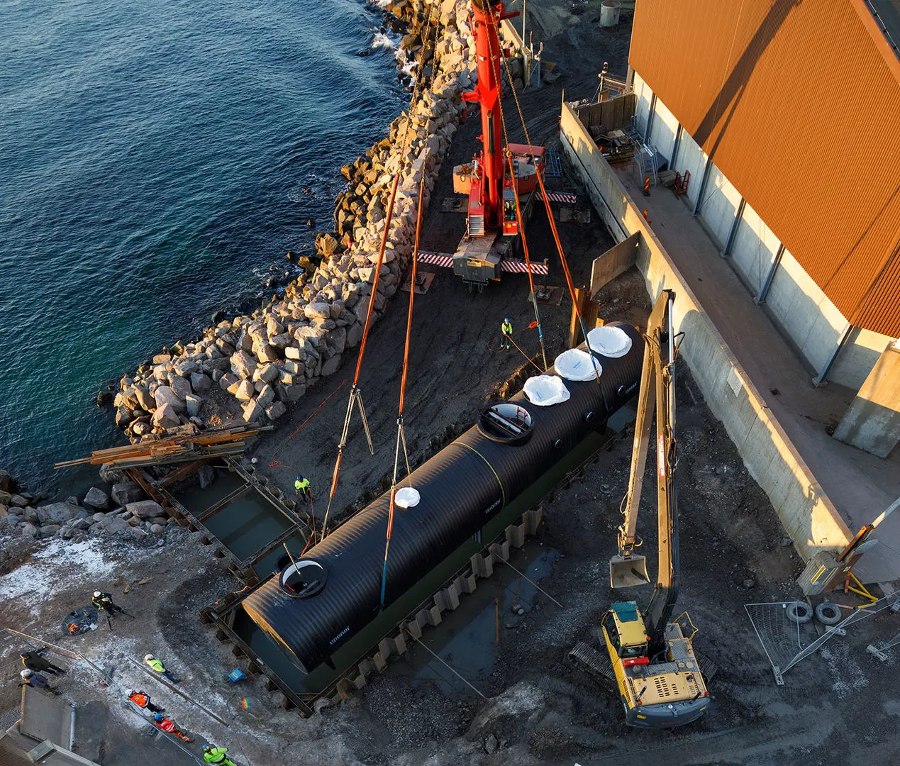 Initially, there was no guarantee that Öresundskraft would choose Uponor Infra and Weholite. The initial plan involved creating an in-situ cast concrete structure. However, the choice became easy when Öresundskraft considered the advantages of Weholite: the huge savings to be made and no risk from concrete disintegrating through exposure to seawater. The pump station is the largest prefabricated structure in Sweden, at 23 metres long and with dimensions of ID/OD3,500/3,900mm. Weholite enabled the pump station to be prefabricated at Uponor Infra’s factory in Fristad, transported to Helsingborg, and lowered into place in a water-filled sheet-piled cofferdam. This method hugely rationalised the work and would not have been possible on the basis of concrete construction.