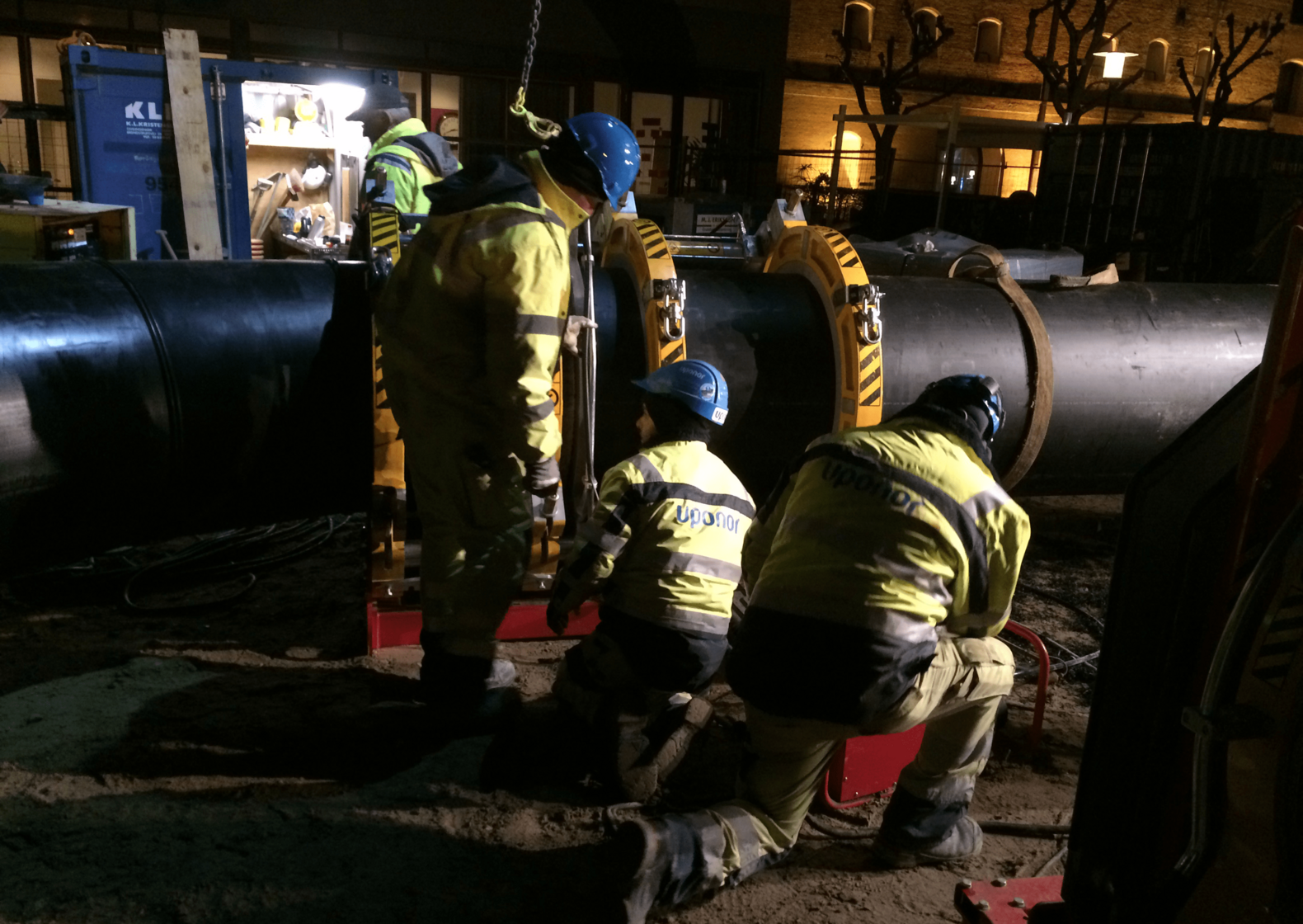 Butt welding by night of 900 mm pipes ensures stable operation of a district cooling solution in Copenhagen Harbour.