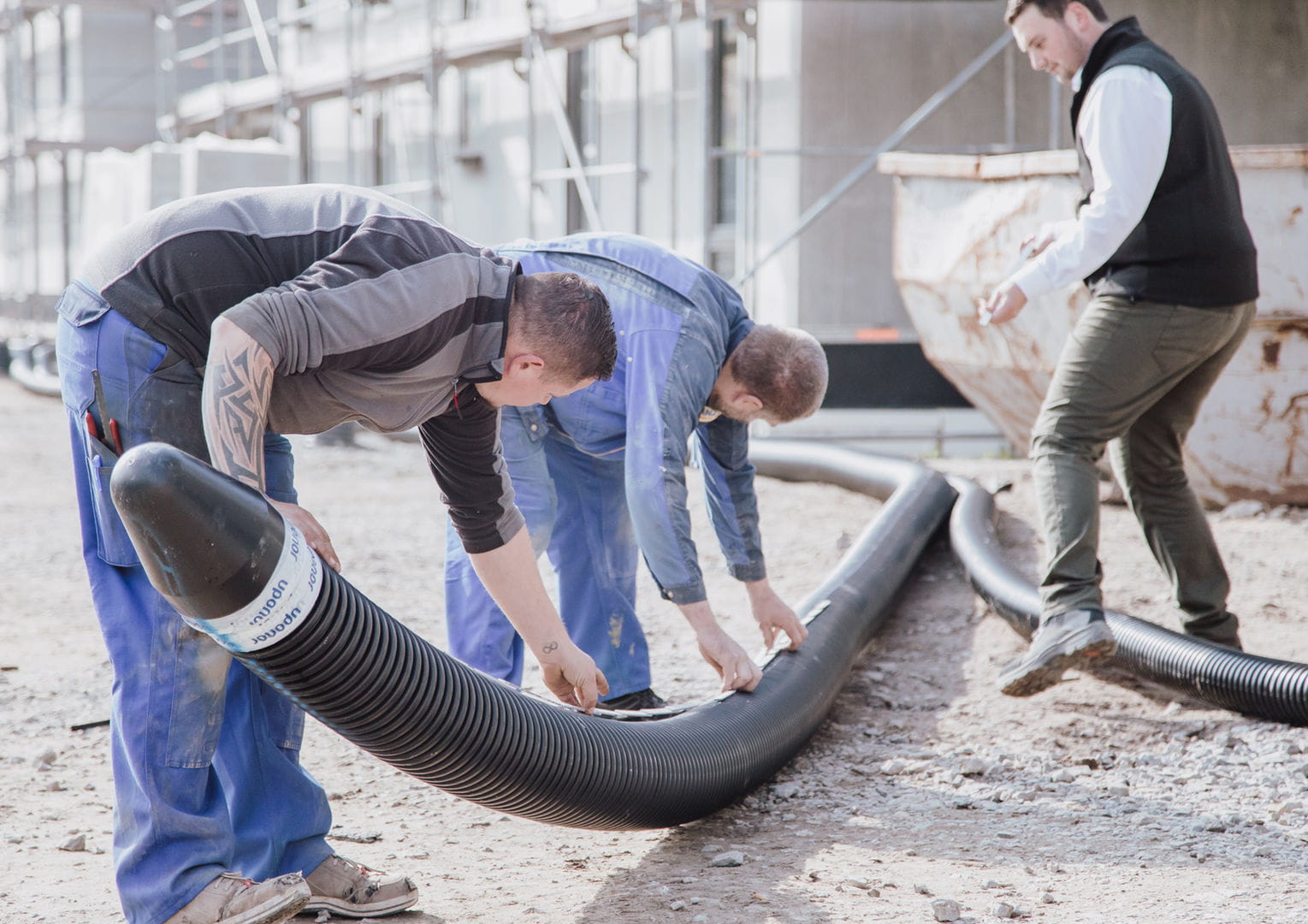 Die Rohrleitungen für die Wärme- und Wasserversorgung wurden in einen eigens für die drei Stadthäuser angelegten Versorgungs- und Medienschacht eingeschoben. Hier kamen PEX-gedämmte Kunststoffrohre des Typs Ecoflex von Uponor mit einer Gesamtlänge von 60 m zum Einsatz, die sich mit ihrem gewellten Mantelrohr durch eine hohe Flexibilität auszeichnen. So erleichterte die einfache Handhabung das Einschieben der in vorkonfektionierten Längen gelieferten Leitungen in den fertigen Betonschacht. Die rechtwinklige Anbindung der Hausanschlüsse ließ sich anschließend einfach mit dem bewährten Quick & Easy Presssystem realisieren. Dieses lässt sich deutlich schneller verarbeiten als herkömmliche Schraubfittings und sorgt für eine dauerhaft dichte und sichere Verbindung mit hoher Leckagesicherheit.