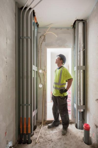 For the ascending lines of the water supply, Uponor composite piping is used, because it is corrosion-resistant, no matter the water’s type or quality. The piping combines the best properties of metal and plastic pipes, which yields the maximum service life. In the sewer in the elements, Uponor’s plastic drainpipes are used, which combine with the element structure to meet the modern fire-resistance and acoustic requirements. Replacement of the ventilation ducts also yields benefits over the ducts built in place from construction materials. The new ventilation ducts are easier to dimension and balance than are those laid in place. Renovation with Uponor Cefo prefabricated elements is not just a modernisation but a complete fundamental improvement of building technology.