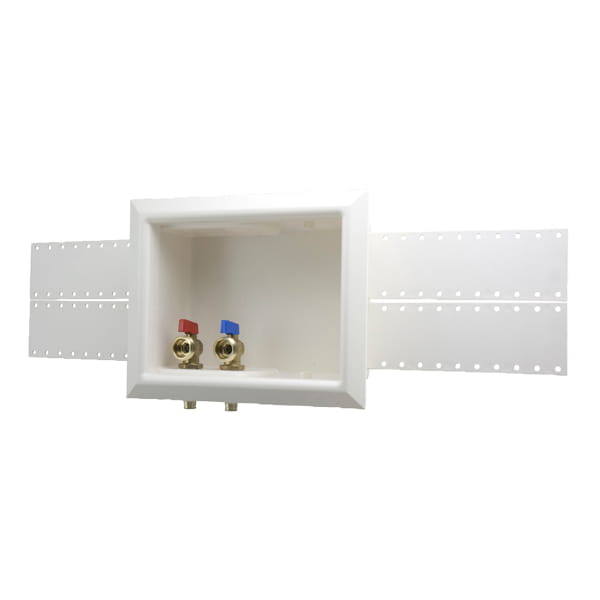 ProPEX washing machine outlet boxes come with two 1⁄2" ProPEX LF brass color-coded hot and cold valves. The versatility of the box allows the installer the freedom to mount the box with the valves either on the top or bottom. The four support brackets make mounting the box quick and easy. The included snap-on cover plate accommodates up to 1" drywall.Note: ProPEX tool is required. ProPEX rings sold separately.