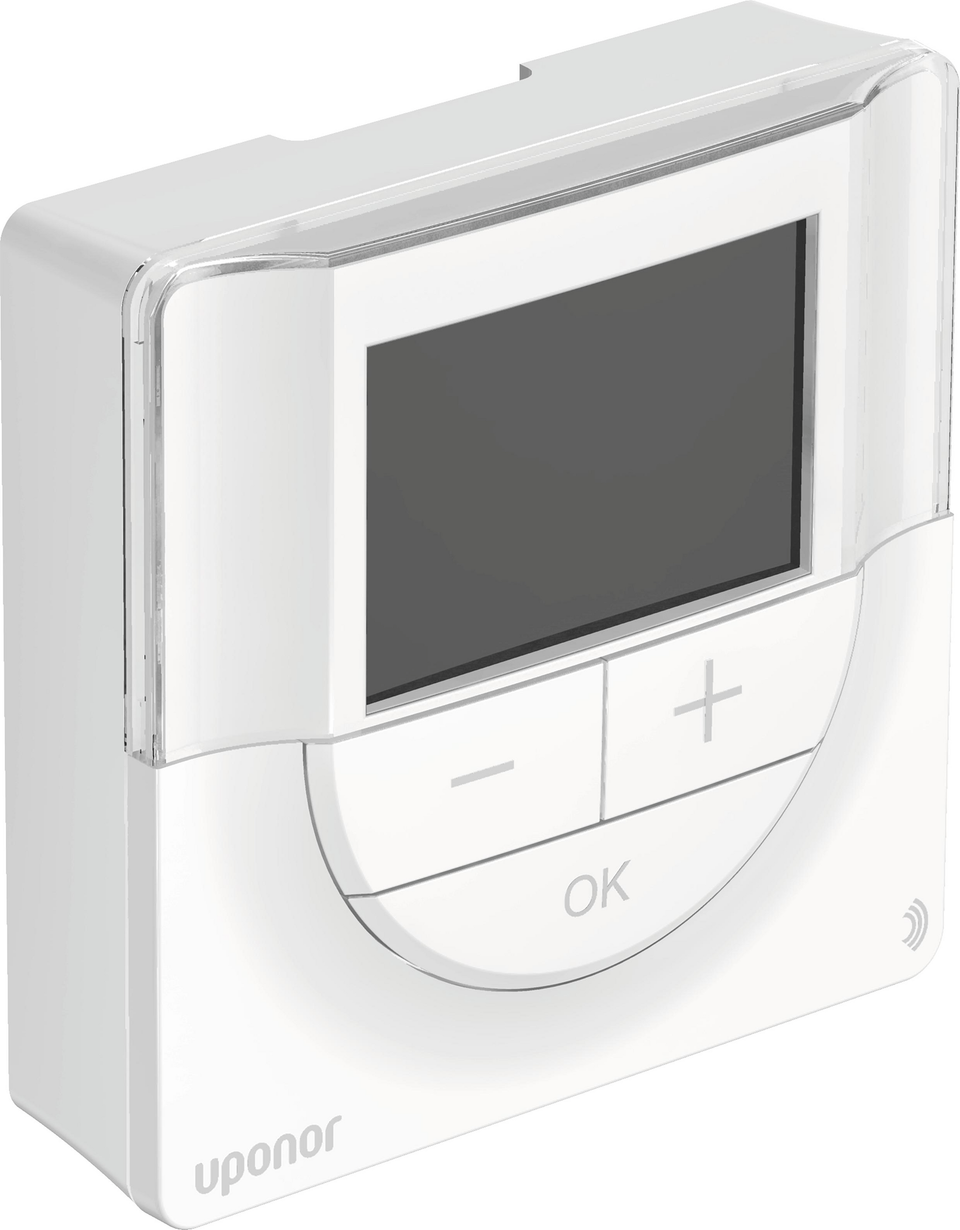 - measures and displays the perceived room temperature- operating distance: max. 30m- protection class: IP30- color: white glossyFunctions:- heating or cooling demand indication- manual H/C changeover function (available with Uponor Smatrix Move only)- cooling allowed function (room by room)- displays celsius or fahrenheit- operating modes: room temperature (RT), internal with floor max/min (RFT), remote sensor (RS), remote outdoor (RO)- low battery indication- mode reception from timer- night set back- display with backlight (dims 10 seconds after last button event)- displays software version (on power-up)- compatible with Uponor Smatrix Move supply cont. X-157 Wired (1071693)- optional: floor sensor can be connectedConsisting of:- Uponor Smatrix Wave thermostat digital T-166- 2x AAA batteries- mounting material