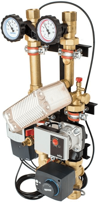 - Pumpgroup pre-mounted with supply temperature controller Uponor Smatrix Move- Outdoor temperature sensor (for installation on buildingsite)- Water temperature sensor for supply temperature- 3-way-mixing valve- Motor drive- Proportional pressure control- Upgrade to heating/cooling possible