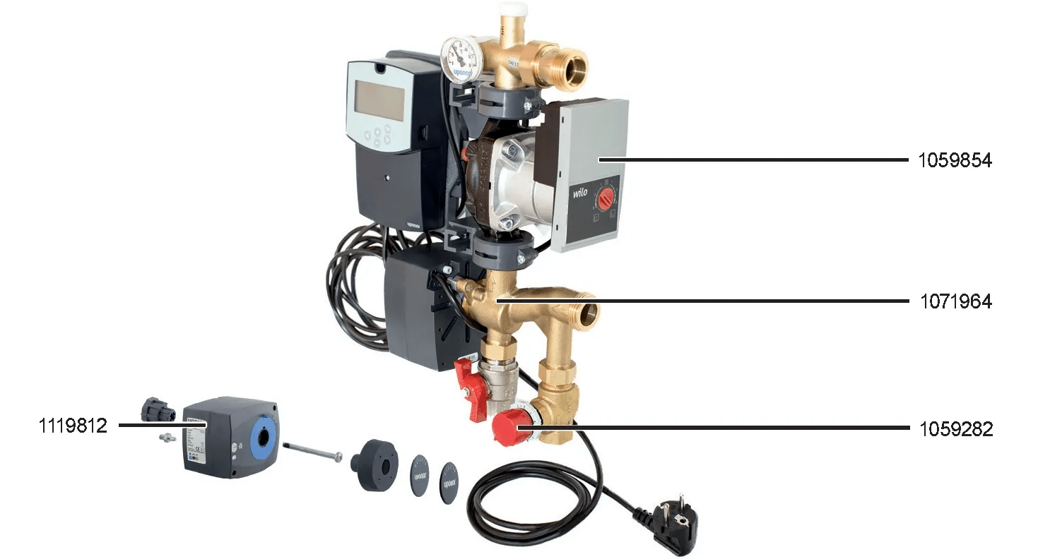 - Pumpgroup pre-mounted with supply temperature controller Uponor Smatrix Move- Outdoor temperature sensor (for installation on buildingsite)- Water temperature sensor for supply temperature- 3-way-mixing valve- Motor drive- Proportional pressure control- Upgrade to heating/cooling possible