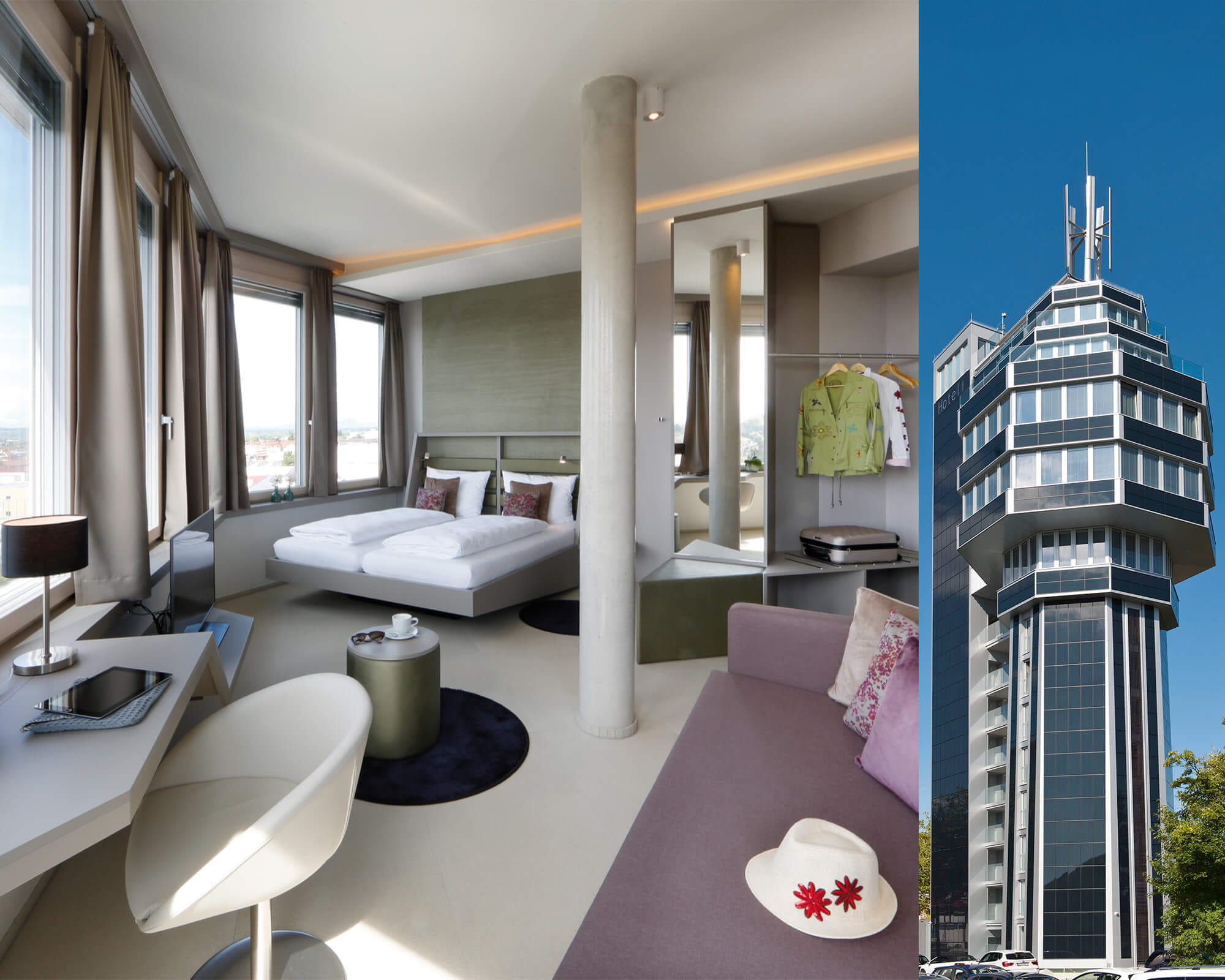The former water tower located at the Lake Constance was turned into a design hotel during renovations in 2017. With this, the building was converted into the first plus-energy high-rise building in Germany.