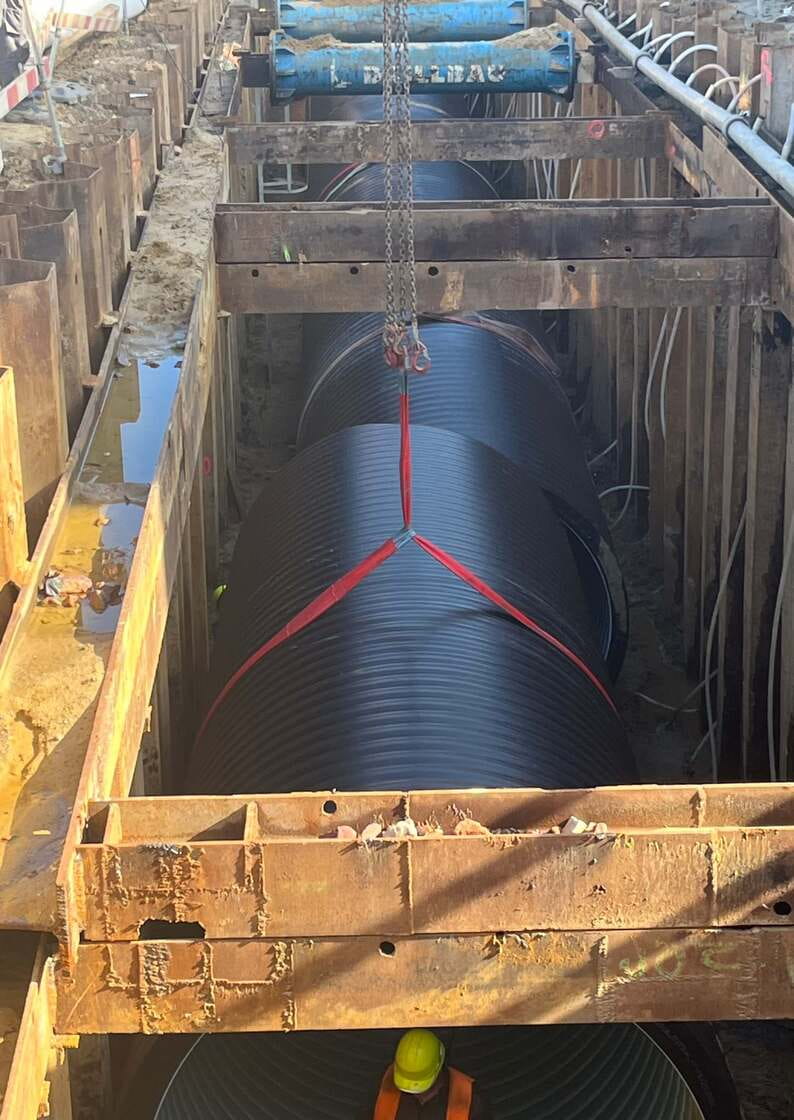 The underground PEHD SN8 DN2500 retention tank with a length of 80 meters and a capacity of over 392 m³, together with a new pumping station, is one of the key elements of the drainage system for the "Agata Junction." This is due to the high frequency of stormwater inflow in the area of the road crossing located in a depression beneath the overpass. Once the new drainage system is operational, stormwater — rather than accumulating on the road, forming puddles, and causing traffic paralysis — will flow directly into the tank, which will be emptied continuously.