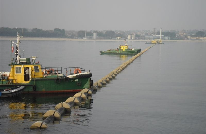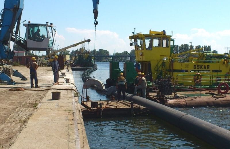 For the project, Uponor Infra manufactured nearly 1.2 km or PE pipes – WehoPipe PE 100 SDR 22 DN 710. The pipes were delivered in 15-metre sections and then butt-welded on the wharf of the contractor. The contract also obliged the company to provide welding machines and installation crew, who made most of the joints including a non-standard fitting (diffuser). The next step was the installation of concrete blocks on the pipeline to facilitate the sinking operation. The weight of the blocks was so designed that the collector, filled with water, was safely placed on the riverbed. The discharge pipeline was towed by tugboat to the installation place and submerged.
