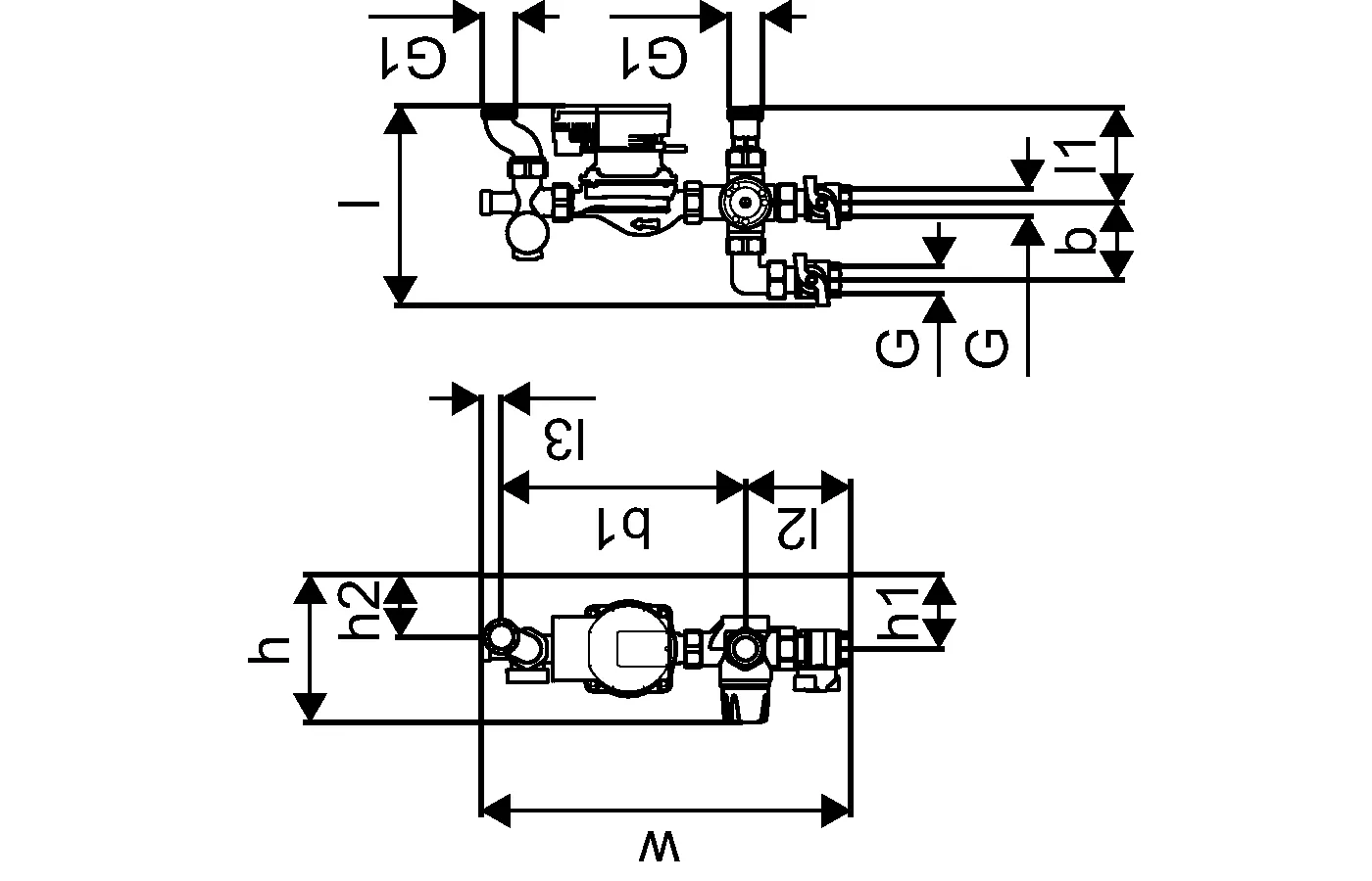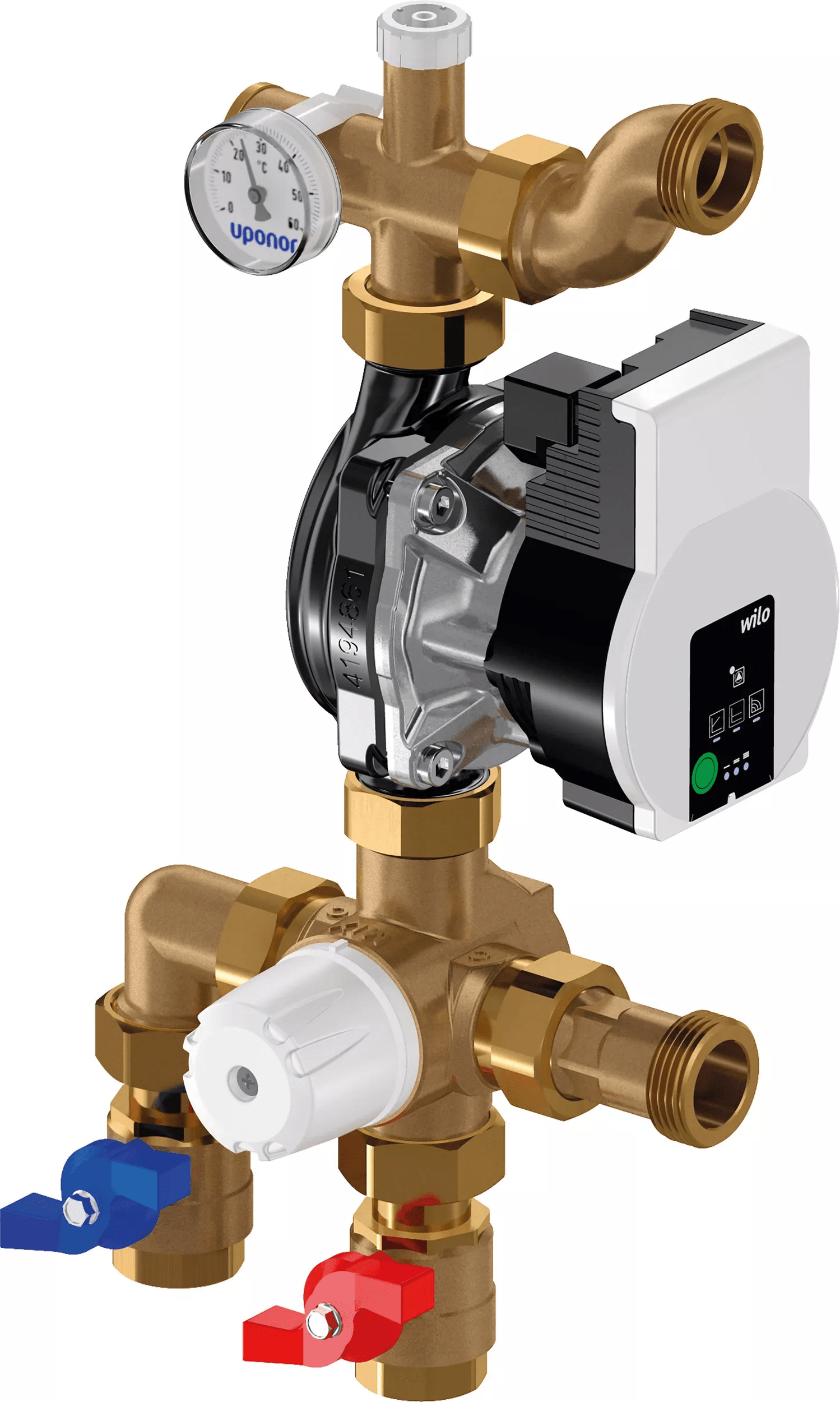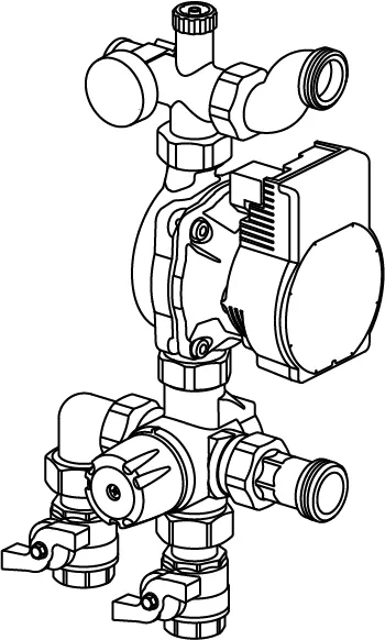 - Integrated pump: Q: 0,1 - 0,4 m³/h, H: 0,2 - 1,1 m, Phyd< 1W - Bracket for left or right installation - Air bleed screw - Secondary circuit temp. range 20-50°C - Balancing valve - Secondary loop 3/4" Eurocone - Primary valves with clamp connection for CU-Pipe 15mm - For control of UFH in small zones - Max. primary temperature: 90°C - Max. secondary temperature: 55°C - Maximal heat load: 15 kW - kvs flow valve: 3,2 m3/h - Water temperature and flow rates controlled by thermostatic 4 way valve