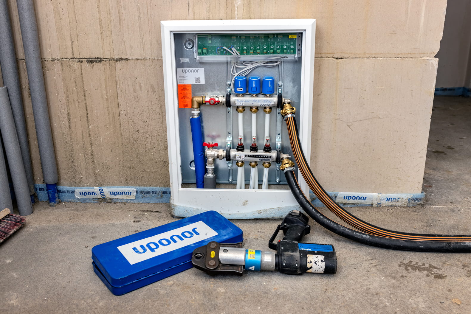 For the 20,000 square meter area, the executing companies installed a total of 140.000 meters of PE-Xa -Comfort Pipe. The pipes ofTacker the wet installationon system and all other components are coordinated with each other, so that the system can be laid very quickly and easily. The distributorsComfort Port Uponor delivered completely pre-assembled and wired to the construction site - this saved around 2.5 hours per distributor in assembly and set-up time on site. Installation is carried out by means of tool-free alignment using a built-in spirit level, adjustable pipe guide bends and height-adjustable feet.