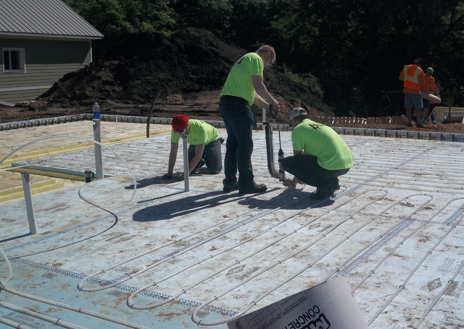 Uponor partners with Habitat for Humanity to build homes in Eco Village; Wirsbo hePEX radiant heating system installation.