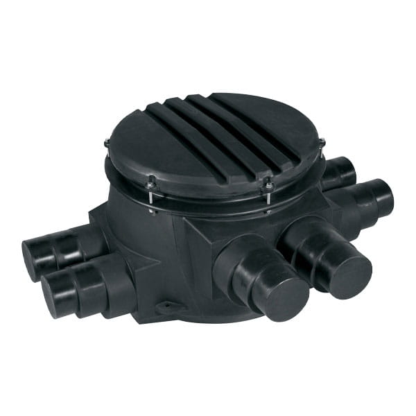 Connection vaults provide a fully watertight, insulated enclosure for multiple straight-through and branch connections. Buried underground, connection vaults allow the system designer to virtually eliminate all branch connections typical in traditional underground system design. Step-down outlets are compatible with the majority of Ecoflex piping.