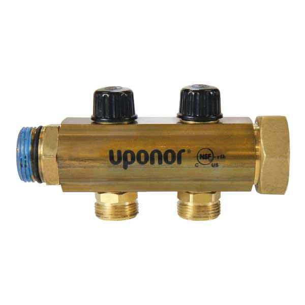 TruFLOW Jr. supply manifolds with balancing valves are used in conjunction with either the TruFLOW Jr. modular manifolds with isolation valves or the TruFLOW Jr. modular valveless manifolds to complete the manifold set. The TruFLOW Jr. supply manifolds with balancing valves allow manual flow balancing of the individual loops on the manifolds. Manifolds are available in 2- to 4-loop configurations depending on model. The manifold body (1" barrel diameter) ends have R32 threads as shown in the picture. Maximum recommended flow to the manifold is 14 gpm.