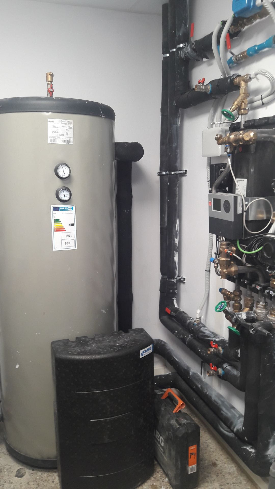 La solución más óptima fue propuesta por Uponor, usar intercambiadores y producción de ACS instantánea en cada área.