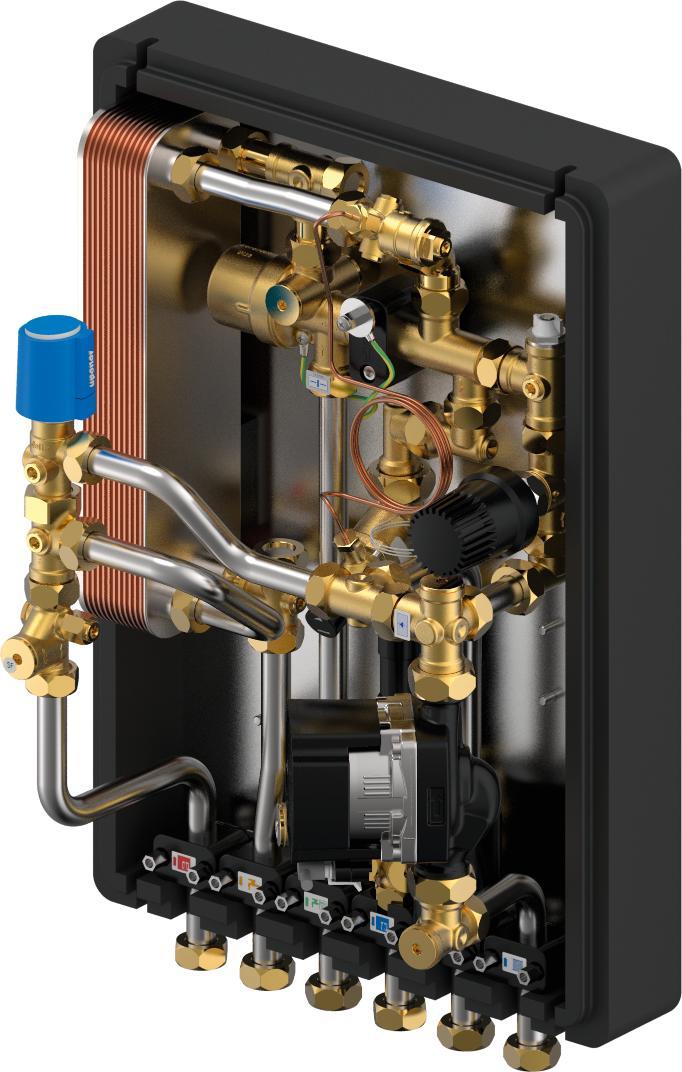 - unidad de interfaz de calor para agua caliente y calefacción- equipo de mezcla secundario con bomba secundaria para suelo radiante y válvula termostática para suministro de calefacción 20-50 ° C- actuador 230V en válvula de zona para conexión a termostato ambiente- regulador de presión diferencial en calefacción primaria