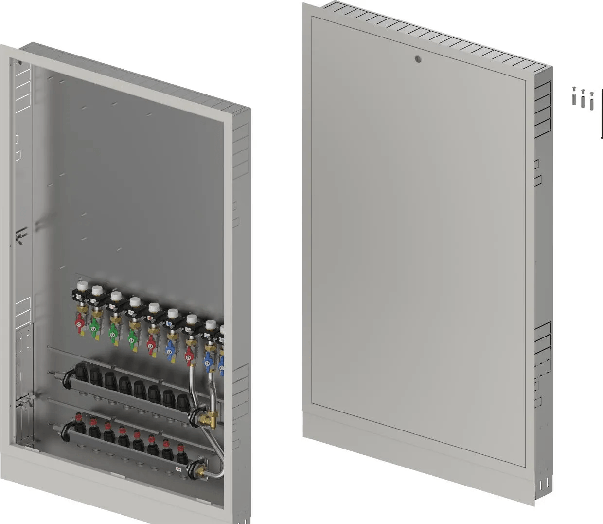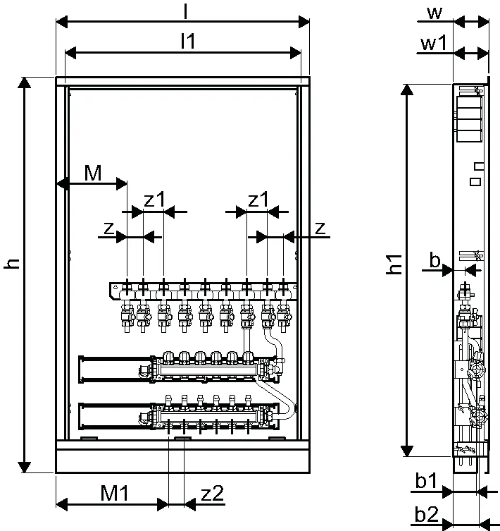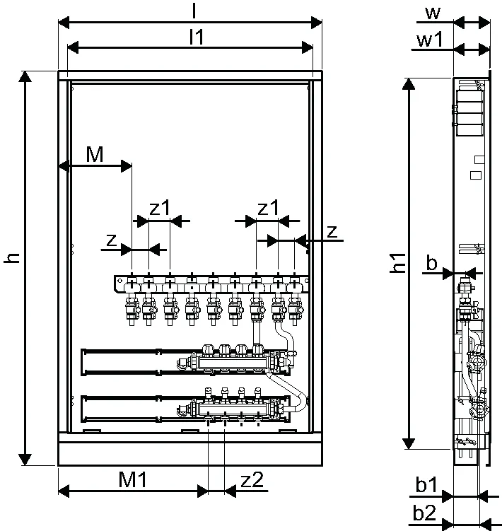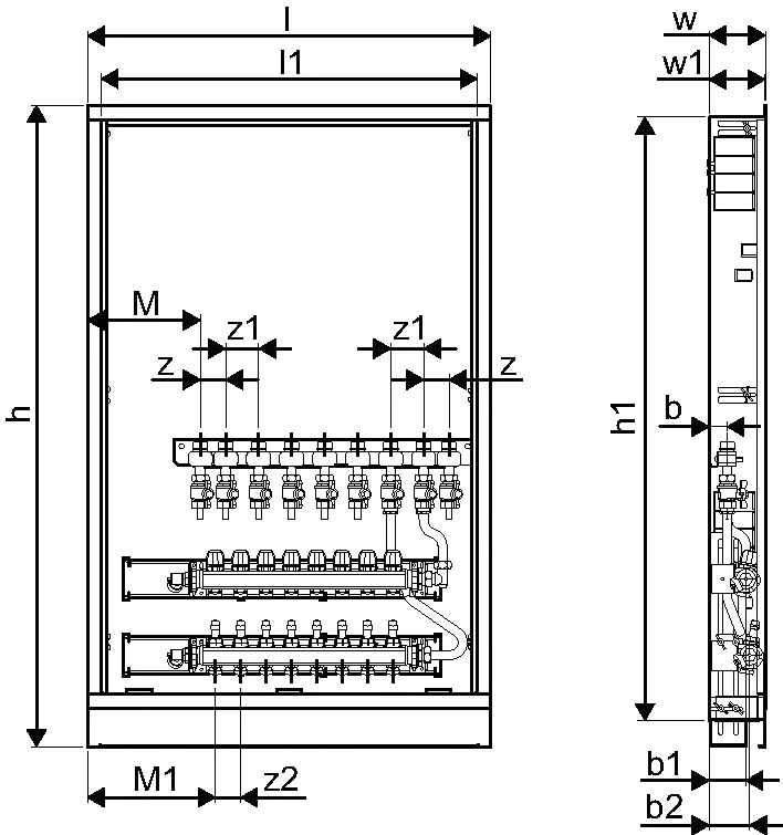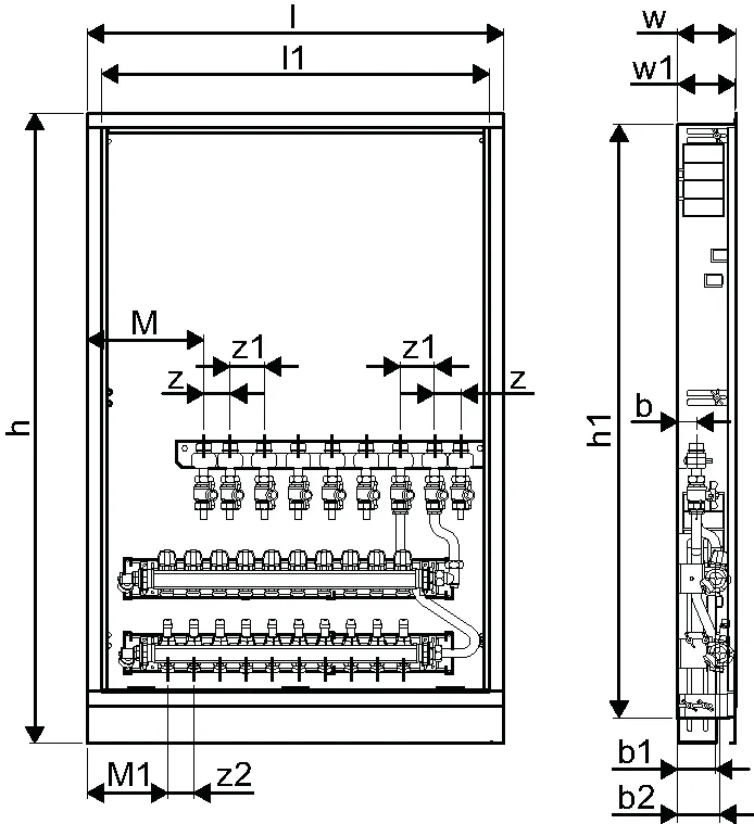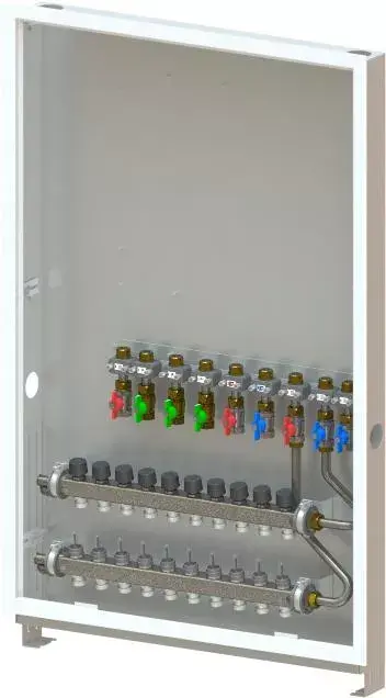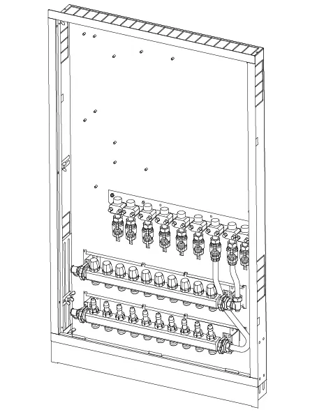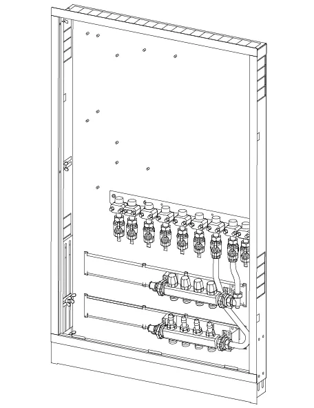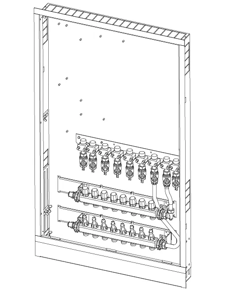 - Caja montada en la pared que incluye pies, colector de calefacción y riel con válvulas de bola DN20 preinstaladas- Códigos de dimensionamiento:-- _HMV – juego de colectores Vario-S para calefacción con _ (4,6,8,10) circuitos de calefacción-- _BV: conjunto de _ (7,9) válvulas de bola preinstaladas en el riel de montaje dentro de la caja para conexiones de interfaz de calor