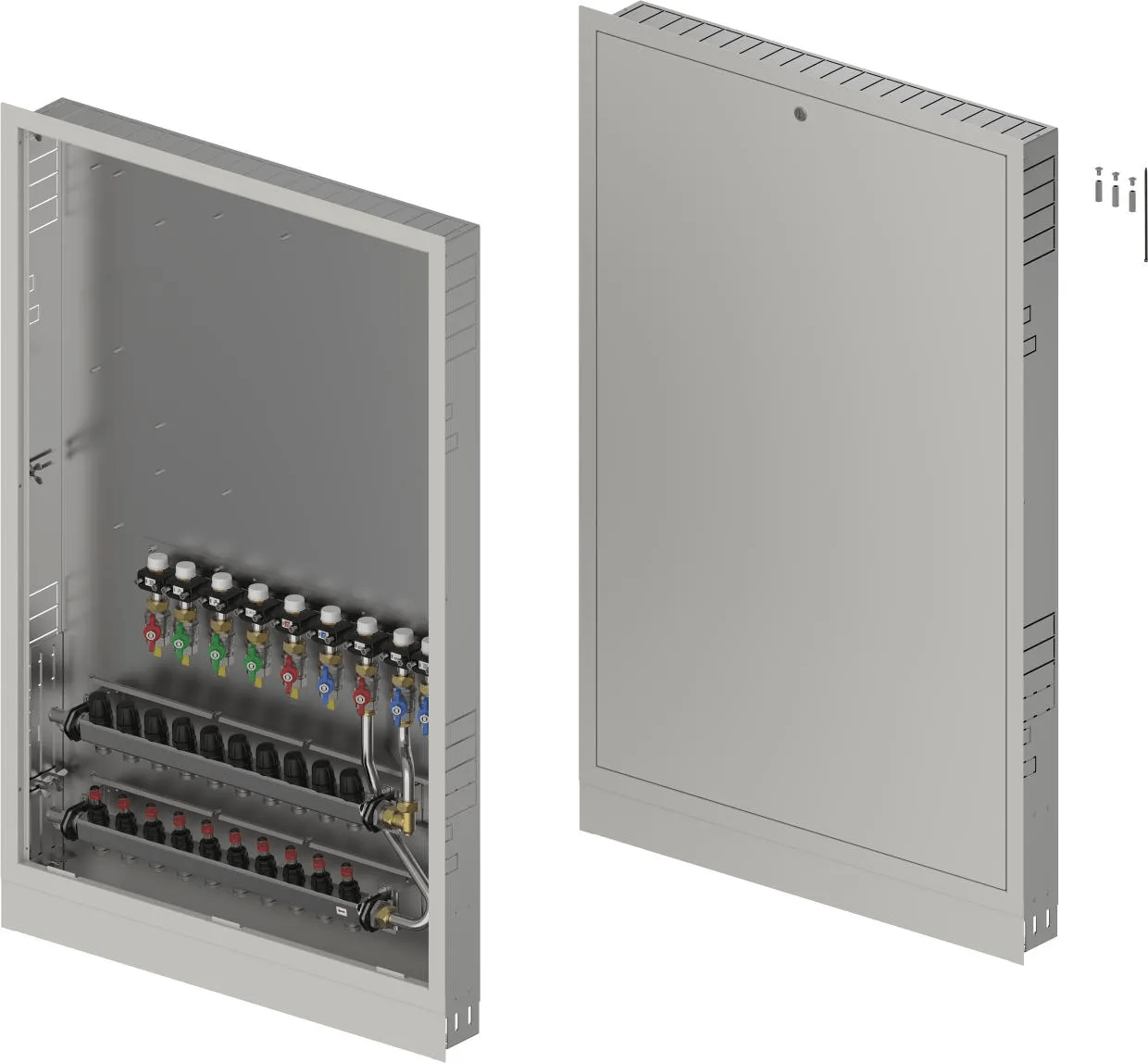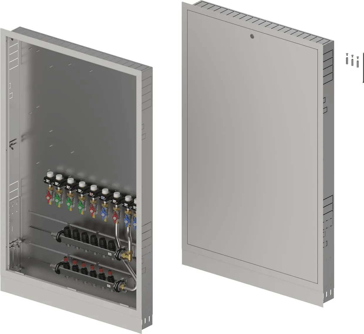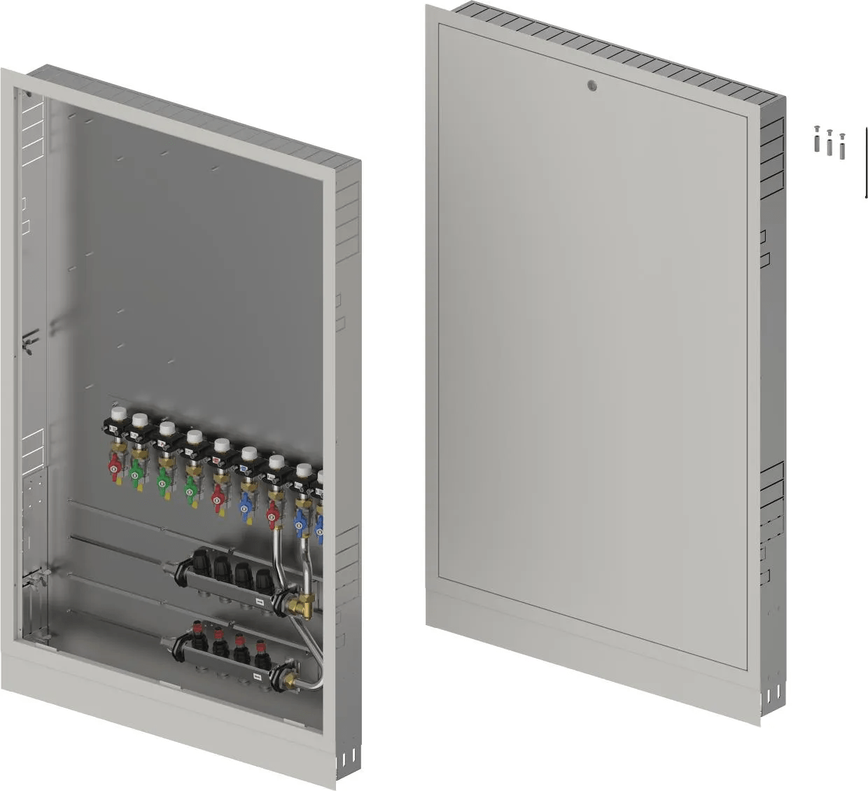 - Caja montada en la pared que incluye pies, colector de calefacción y riel con válvulas de bola DN20 preinstaladas- Códigos de dimensionamiento:-- _HMV – juego de colectores Vario-S para calefacción con _ (4,6,8,10) circuitos de calefacción-- _BV: conjunto de _ (7,9) válvulas de bola preinstaladas en el riel de montaje dentro de la caja para conexiones de interfaz de calor