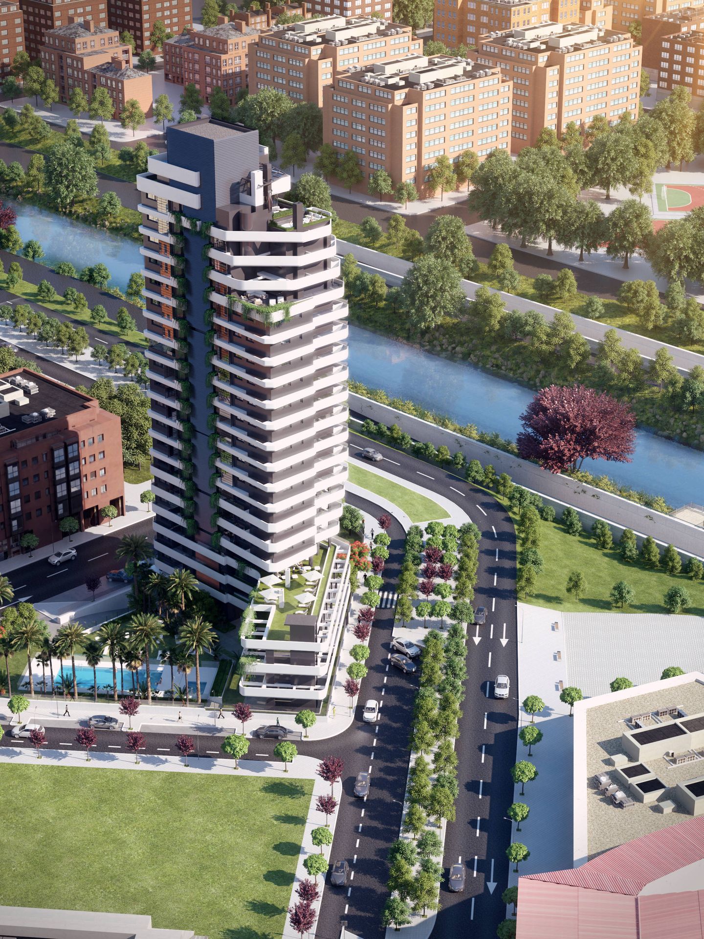 “Una arquitectura que replica en su fachada el trazado del río y las zonas verdes que lo arropan. Contando con todos los elementos de sostenibilidad y aprovechamiento energético necesarios para garantizar la excelencia del modelo dentro de una arquitectura armónica y destacable”.