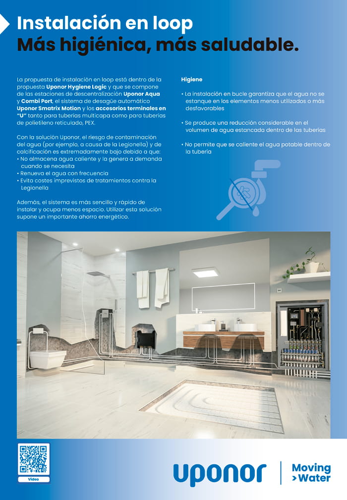 El sistema Uponor Q&E, compuesto por tuberías de polietileno reticulado, PEX-a, y accesorios plásticos (PPSU) o metálicos (latón), es la solución ideal para instalaciones de agua potable y sistemas de calefacción.