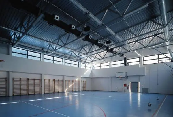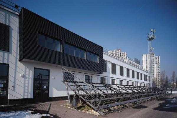 The building is energy efficient with underfloor heating/cooling with boiler room and the Sport hall is acclimatized with climate chamber. All windows in the offices and public rooms are shaded by sliding aluminum blinds.