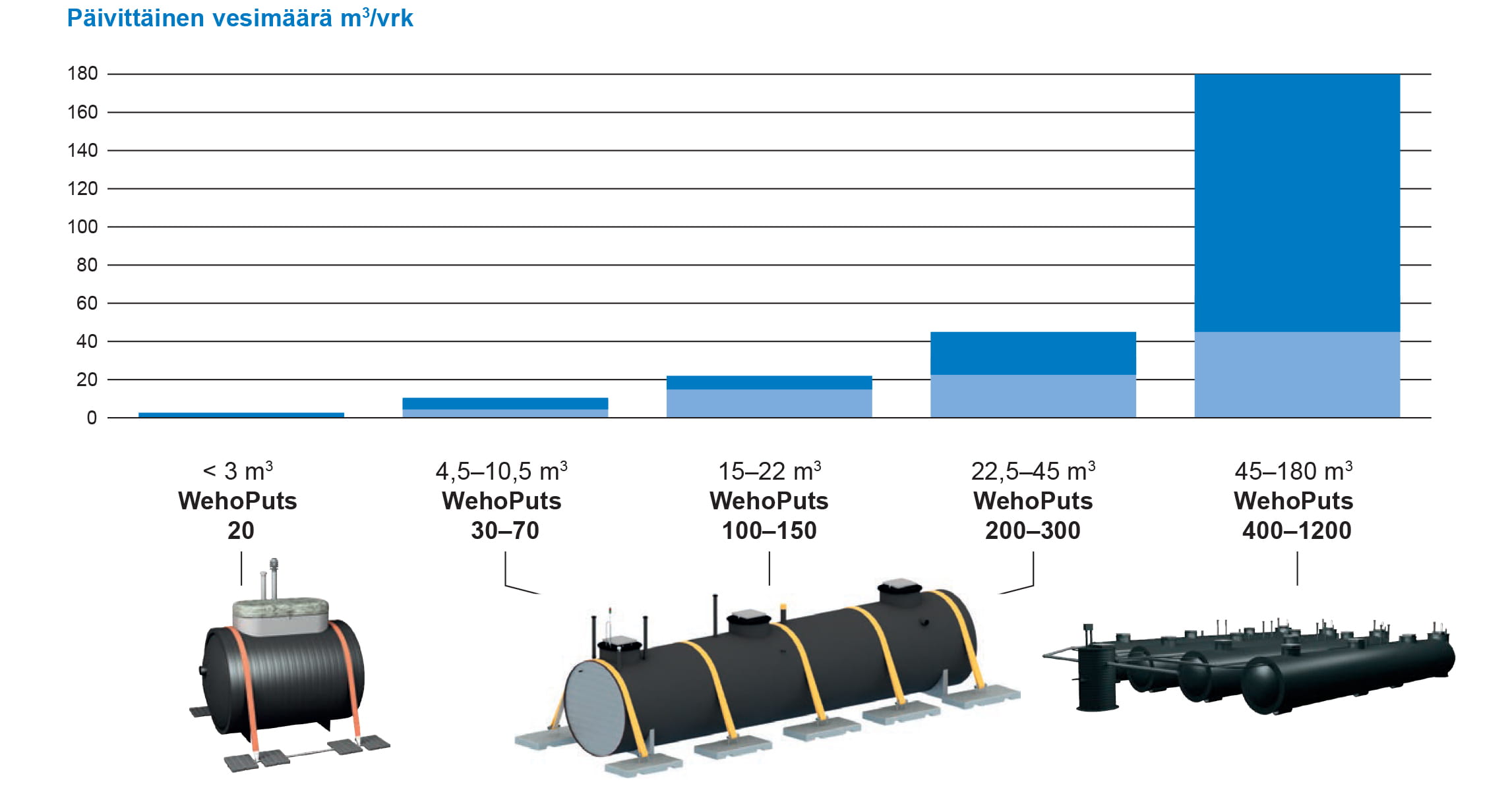 Uponorin tehokas WehoPuts-puhdistamovalikoima ulottuu yhden kiinteistön mallista aina kyläkohtaisiin järjestelmiin. Suomessa kehitetyt WehoPuts-panospuhdistamot on suunniteltu ja valmistettu täyttämään tiukimmatkin vaatimukset.