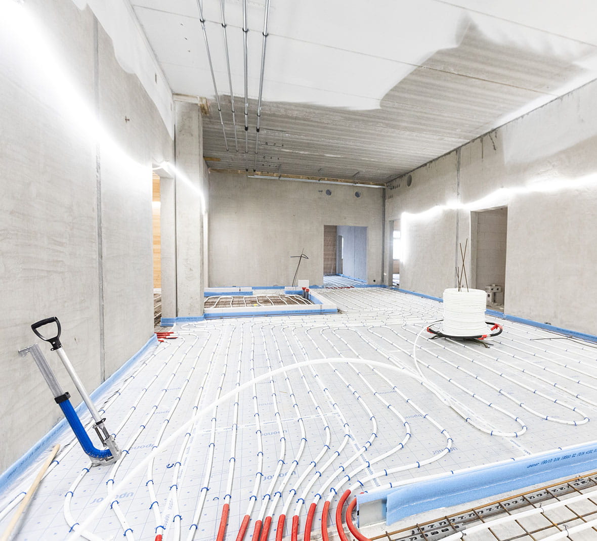 Lattialämmitys asennettiin liikuntasalia ja muutamaa vesikiertoisilla pattereilla lämmitettävää tilaa lukuun ottamatta koko rakennukseen.