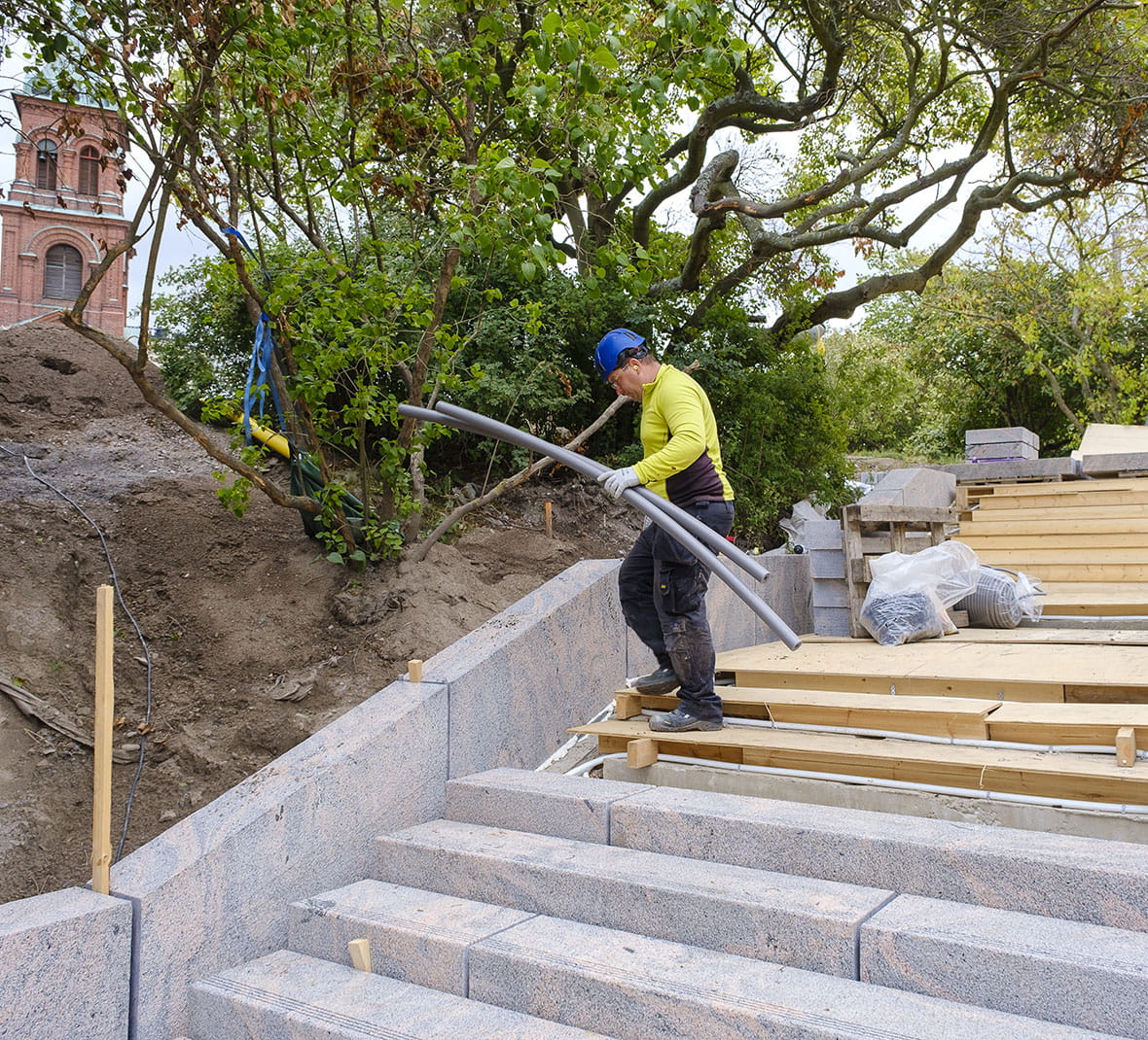 Putkimasterin toimitusjohtaja Kimmo Parviainen kertoo, että urakka oli hänelle ensimmäinen lajissaan. Työ oli pääpiirteissään tuttua lattialämmitysjärjestelmien asentamisesta, mutta nyt maasto toi siihen uudenlaisia haasteita. Portaiden lähellä kasvaa muun muassa vanhoja syreenejä, mongolianvaahteroita ja ruusupensaita, jotka oli suojattava rakennustöiltä.