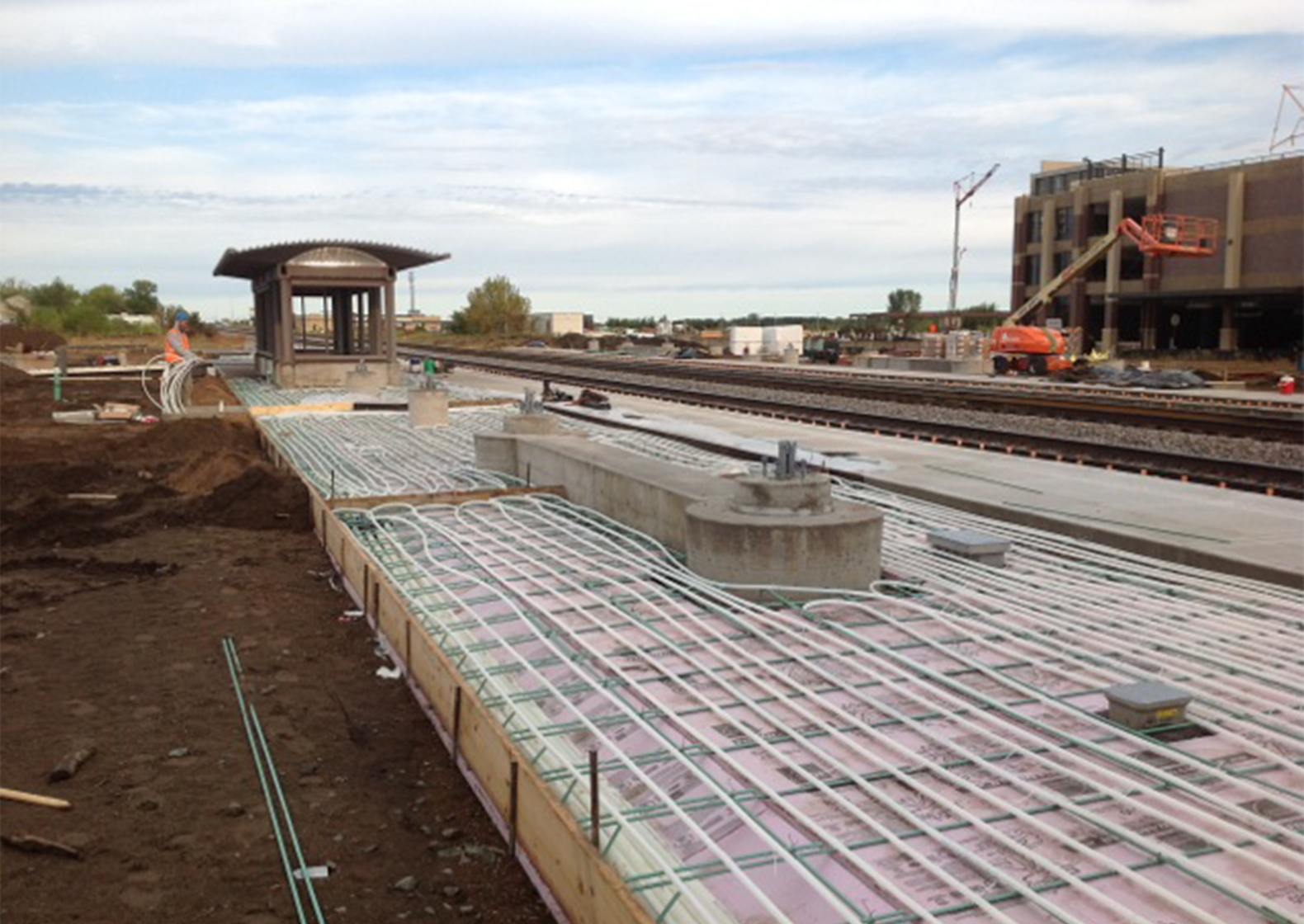 In addition to the ¾" tubing, there are also eight 2" PEX main lines for each platform that run from two manholes in the landscape area, then enter the slabs and stub into the manifold boxes. The two manholes connect through a 16" jacket housed underneath the track that also holds the two 4" main lines that supply the platform.
