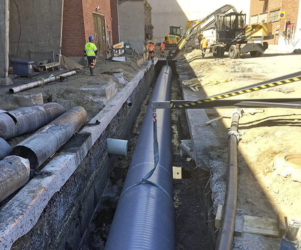 Uponor Infra aloitti valmistelevat työt saneerausta edeltävällä viikolla. Sisähalkaisijaltaan 1 200-milliset Weholite-putket toimitettiin työmaalle 21 metrin pituisina putkisalkoina.