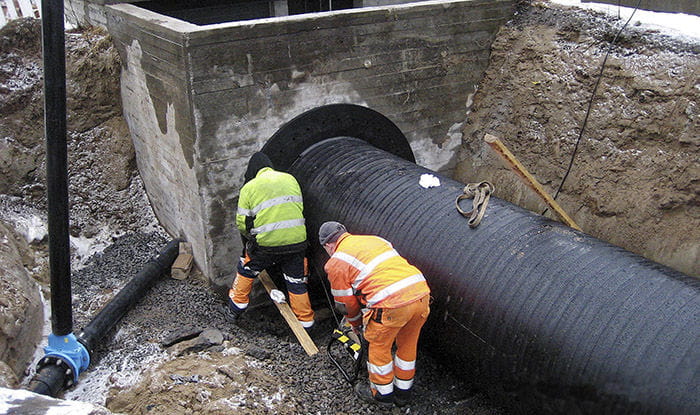 – Kokkolan kohteessa todettiin polyeteenistä valmistetun Weholiten soveltuvan myös pohjavesialueelle, sillä sen kerrosrakenne takaa putkelle tarvittavan tiiveyden ja kestävyyden ilman suojaputkeakin. Kohteessa käytettiin 1 200-millisiä Weholite SN4 low pressure -putkia.