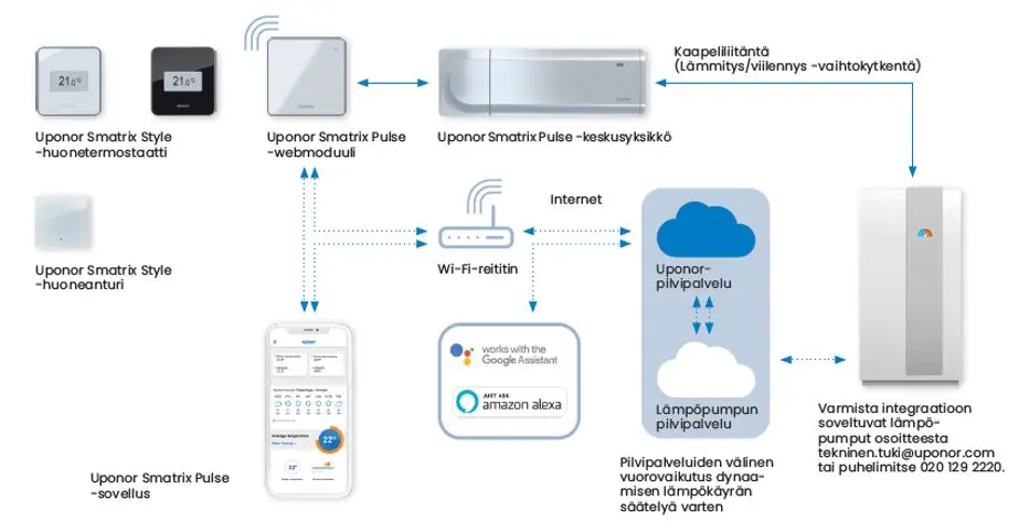 Järjestelmän ohjaus onnistuu helposti älypuhelimen avulla kotona tai mistä tahansa. Tarvittaessa voi antaa luvan asentajalle tarkastaa järjestelmän tilan etänä, esimerkiksi huollon tarvetta kartoittaessa. Uponor Smatrix Pulse voidaan integroida osaksi älykotijärjestelmää (esim. Amazon Alexa), mikä mahdollistaa lämmityksen ohjauksen äänikomentojen avulla.