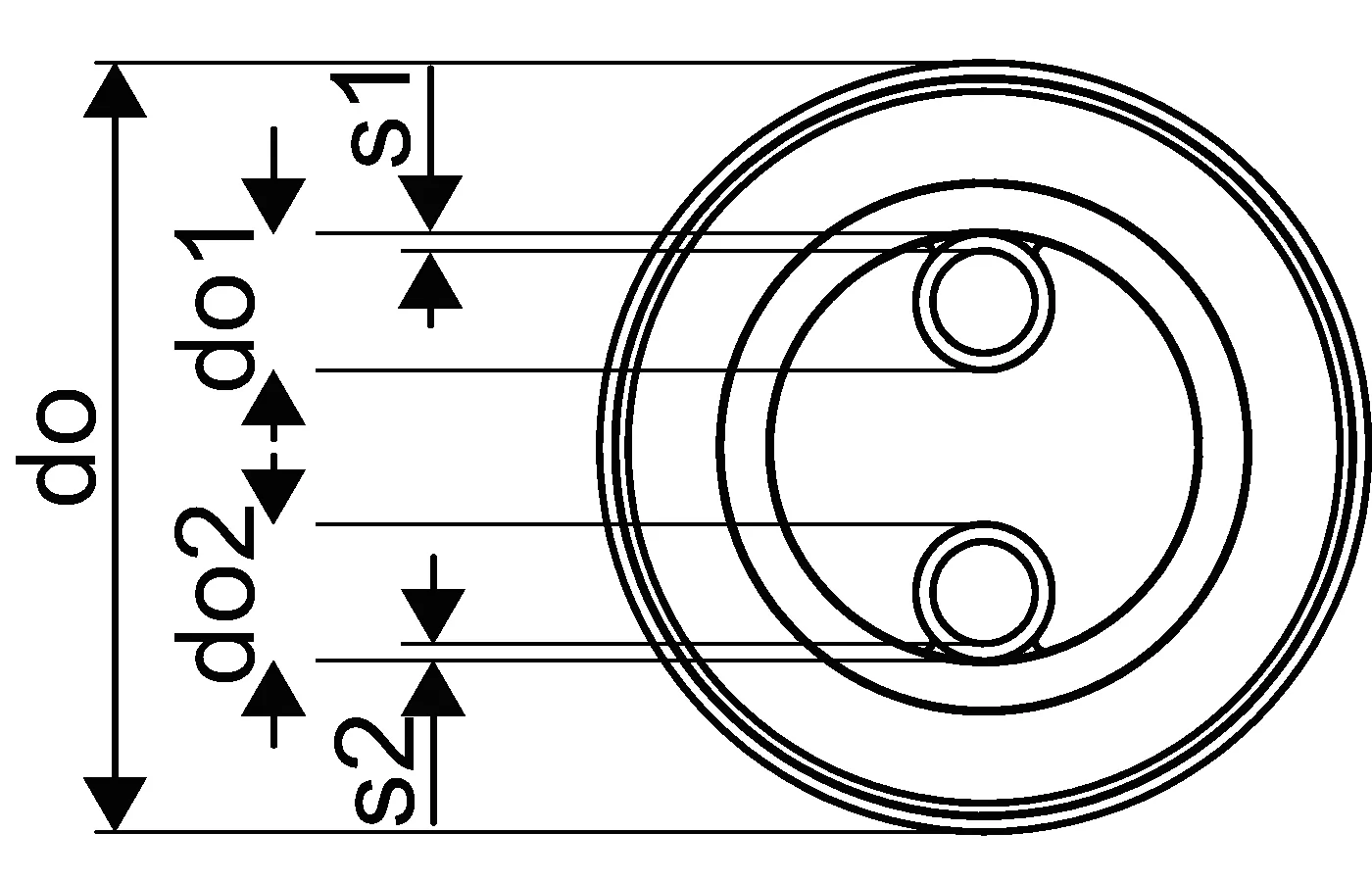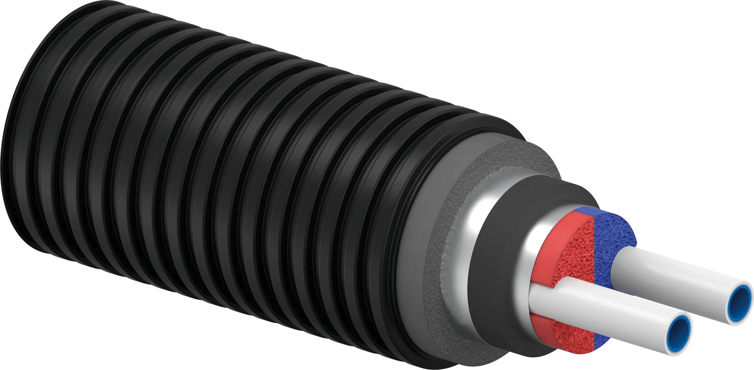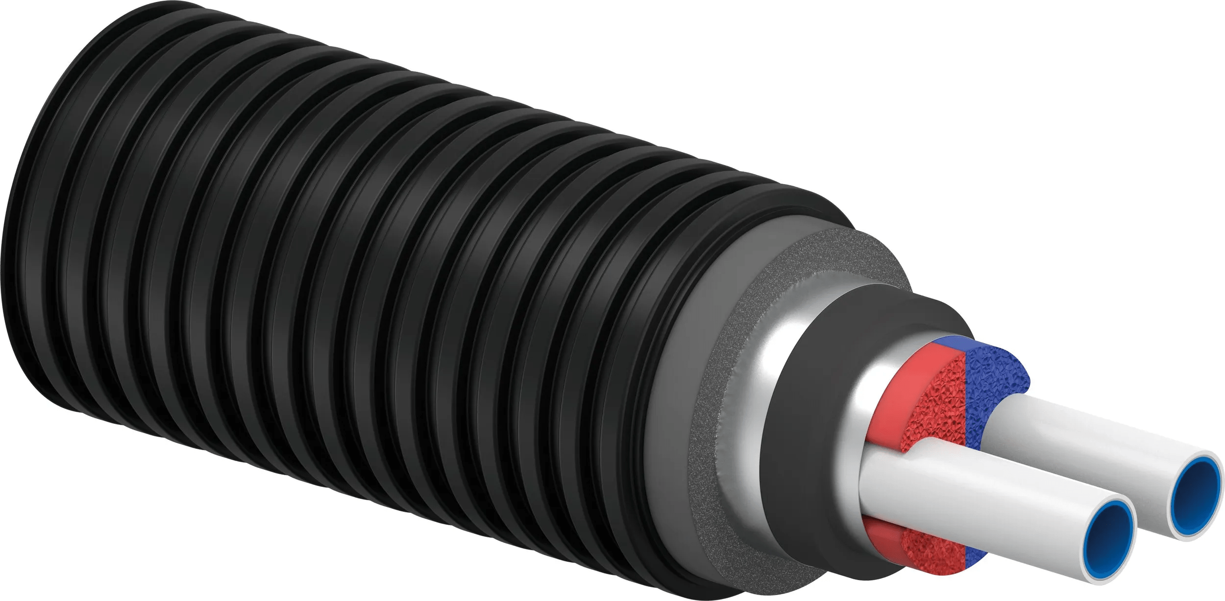 - Taipuisa, eristetty muoviputkijärjestelmä EN 15632 ja EN 17414 mukaisesti- Virtausputki: Happidiffuusiosuojattu ristisilloitettu polyeteeni (PE-Xa, EN 15875), PN 6- Eristemateriaali: Uusi käänteentekevä VIP-eristemateriaali erittäin alhaisella lambda-arvolla (0,004 W/mK) sekä PEX-solumuovi- Suojakuori: Korrugoitu PEH