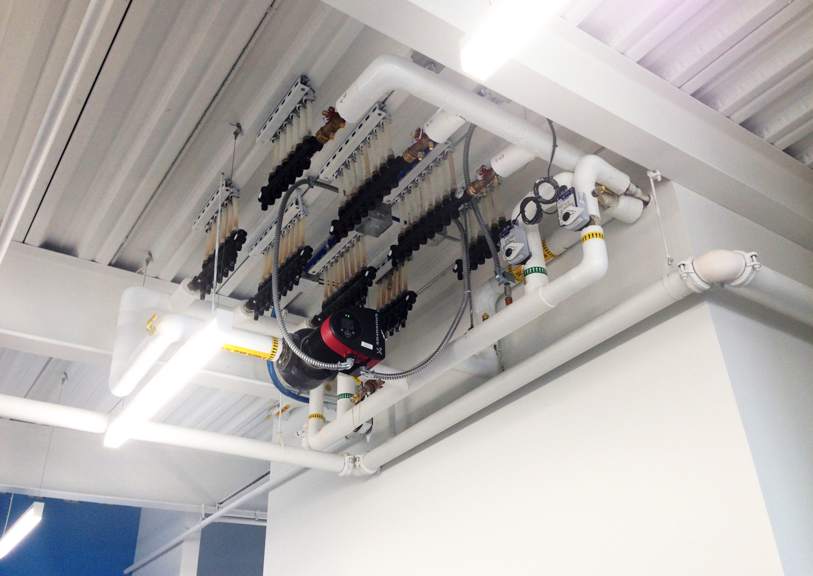 Le bâtiment de 65 000 pieds carrés (6 038,69 mètres carrés) est certifié LEED® Platine et utilise 157 000 pieds (47 853,6 mètres) de sections de tuyaux Uponor AquaPEX® de 3 po à ½ po. Le tuyau est utilisé pour les réseaux de tuyauterie de chauffage et de refroidissement rayonnants, de plomberie et de distribution hydronique. « Nous avons utilisé AquaPEX pour tous les systèmes car nous avions besoin de grandes quantités de tuyaux et il était plus économique d'utiliser AquaPEX et des composants en acier inoxydable pour réduire les problèmes de rouille », a déclaré Makepeace.