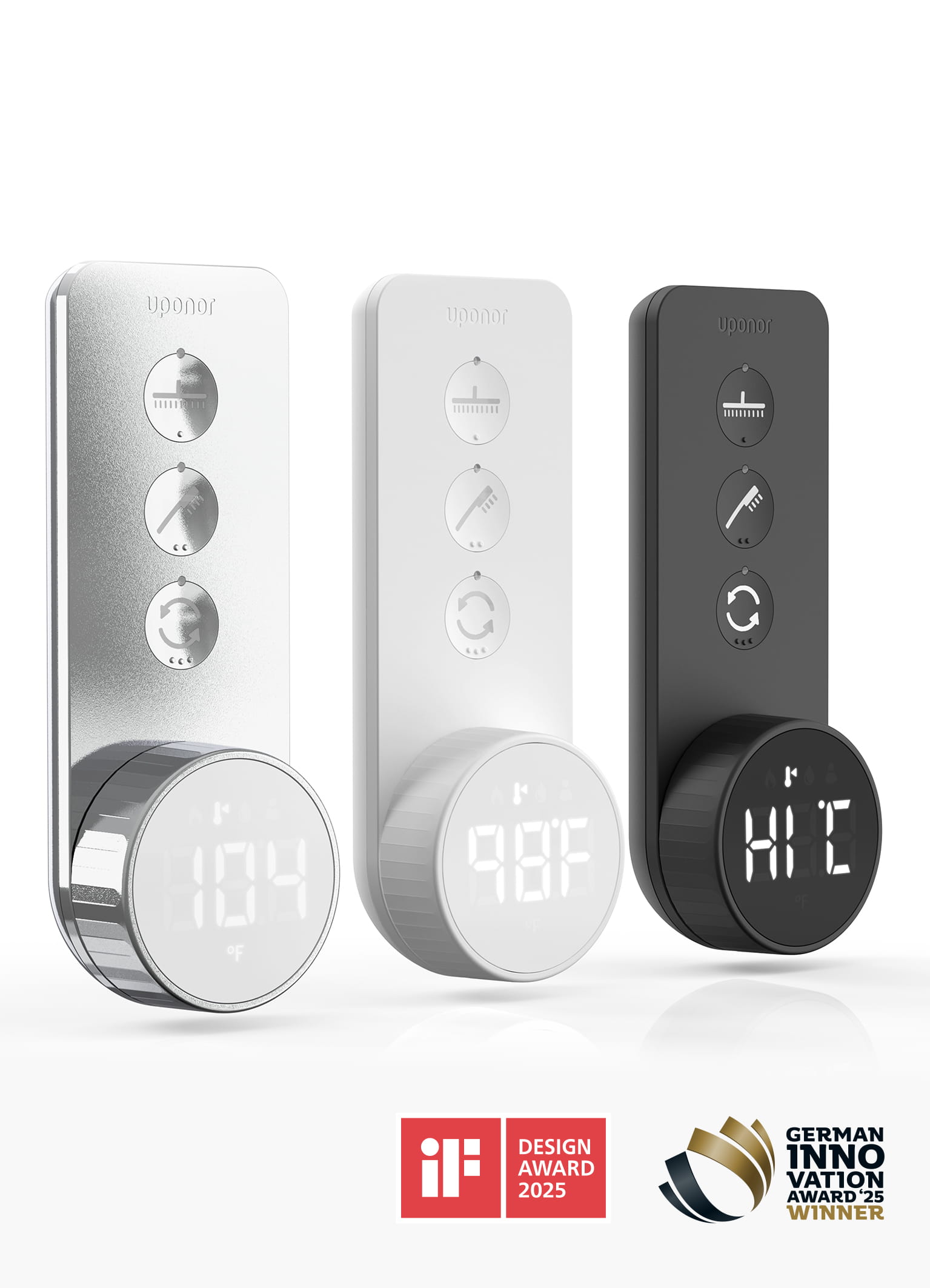 L' I-Shower Uponor a impressionné le jury du German Innovation Award en tant que « ...système qui, grâce à une technologie intelligente et un fonctionnement intuitif, permet non seulement de personnaliser les profils de douche, mais aussi de réduire de manière significative la consommation d'eau et d'énergie ». La combinaison d'un design scandinave minimaliste et d'une fonctionnalité à l'épreuve du temps distingue le produit, ce qui en fait une solution d'avant-garde qui améliore à la fois le confort quotidien et la responsabilité écologique. »