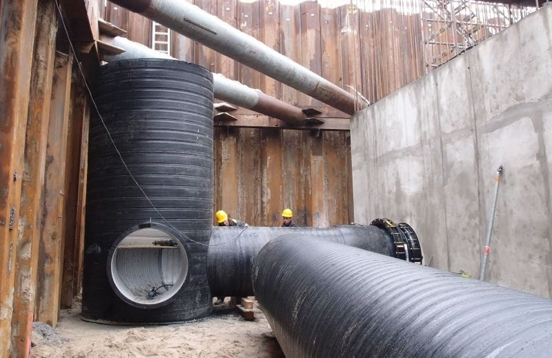The two raw water intakes, which were constructed using PE100 DN 1000 SDR 17 pressure pipes, will provide the 500 MW power-unit pump station with cooling water from the River Vistula. A pressure pipeline connecting the raw water pumping station with the water treatment plant was constructed using PE100 DN800 SDR22 pipes laid in a trench. For the pipeline, PE100 DN800 SDR 17 pipes were installed – using the horizontal drilling method (HDD) – under the bed of the discharge canal. A gravity pipeline feeding mechanically pre-treated water from the cold-water intake to the raw water pumping station was constructed using the Weholite DN1000 SN8 pipe, with Weho DN1800 manholes added for maintenance purposes.