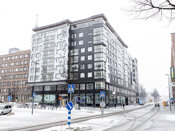 Located at Rautatienkatu 21, Tampere’s former post office underwent extensive expansion and renovation where 89 flats and about 1,000 m2 of office space were built as an addition reaching up to nine storeys. In addition, all the old office spaces and commercial premises in the building were remodelled. The new building is home to the Asunto Oy Tampereen Posteljooninpuisto housing association on floors 2–8, with shops and office spaces on the ground and first floors. The project, commissioned by the Keskinäinen Vakuutusyhtiö Fennia insurance company, was completed towards the end of 2017.
