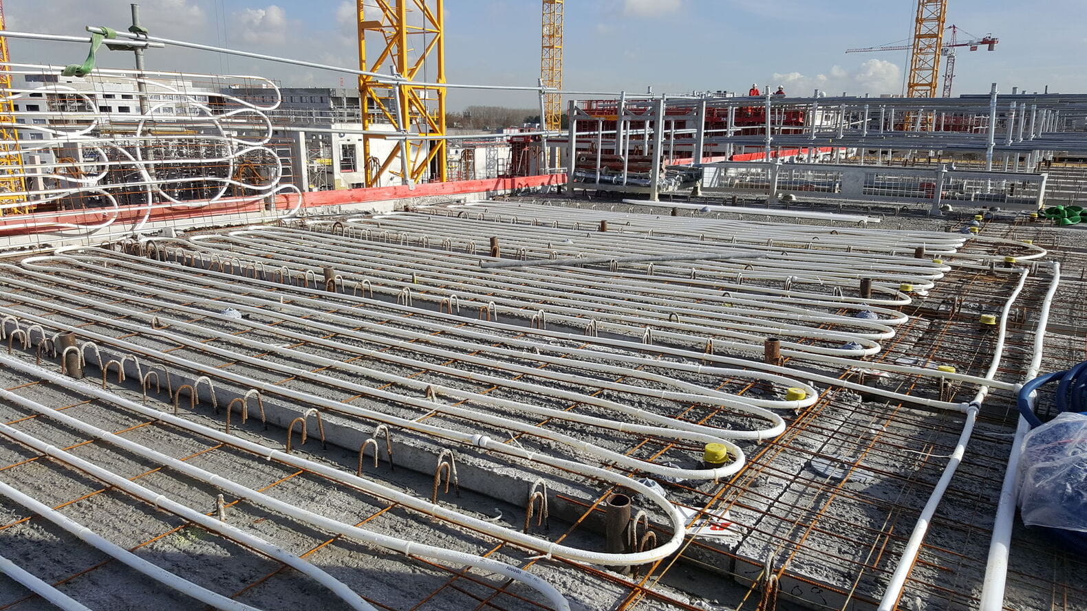 Grâce au travail de François Murguet, c'est pour sa qualité et ses performances que la Dalle Active Uponor a été préconisée par le bureau d'étude OTEIS. Notre système Contec va permettre la diffusion de la chaleur et du rafraîchissement par le plancher et le plafond fournissant une émission douce et confortable pour les usagers Avec ses 40 000m2 de plancher, ce bâtiment représente un véritable défi technique, il a en effet fallu réaliser les plans pour 1878 modules répartis en 265 références différentes représentant 15 862 m2 de surface active.