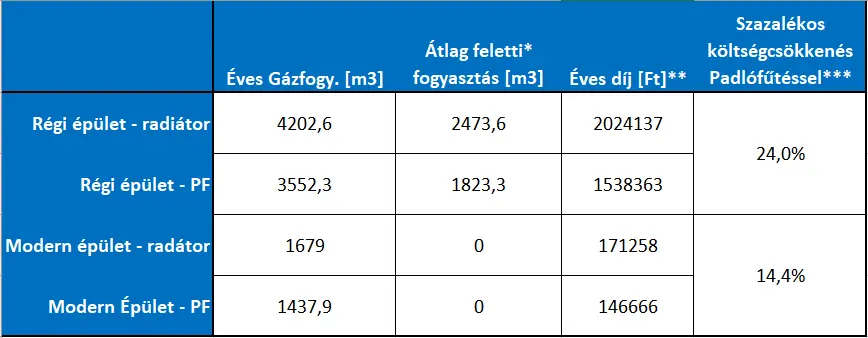 A táblázatból leolvasható hogy egy korszerű és egy régi épület milyen gázfogyaztásszal és fűtési díjjal rendelkezik, radiátoros- és padlófűtés esetén.